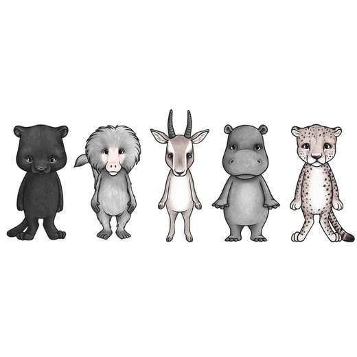 Får vi presentere afrikanske venner… De er alle her – panteren Pepper, babianen Bonbon, gasellen Gigi, flodhesten Filippo & sist men ikke minst geparden Zitah. \n \nDisse er hver for seg små kunstverk og kan dessuten flyttes rundt akkurat som du vil ha dem. Veggklistremerkene er laget i materiale av høyeste kvalitet og kan enkelt festes på alle typer malte vegger eller tapeter. Dette gjør at de…