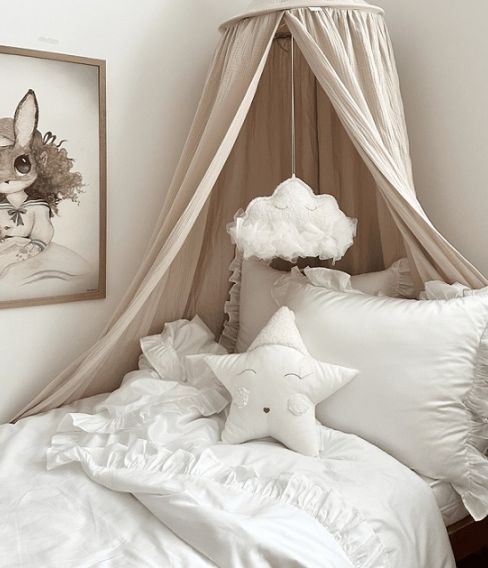 En meget sjarmerende og vakker aprikosfargede sengehimmel laget av høykvalitets bomull. Designet i en enkel form og i en typisk skandinavisk stil. I hvert rom som denne brukes vil en eventyrfølelse spre seg. Perfekt for å innrede barnerommet på en god måte. Sengehimmelen er dessuten forberedt med en praktisk anordning i midten for å kunne henge opp favorittingene.