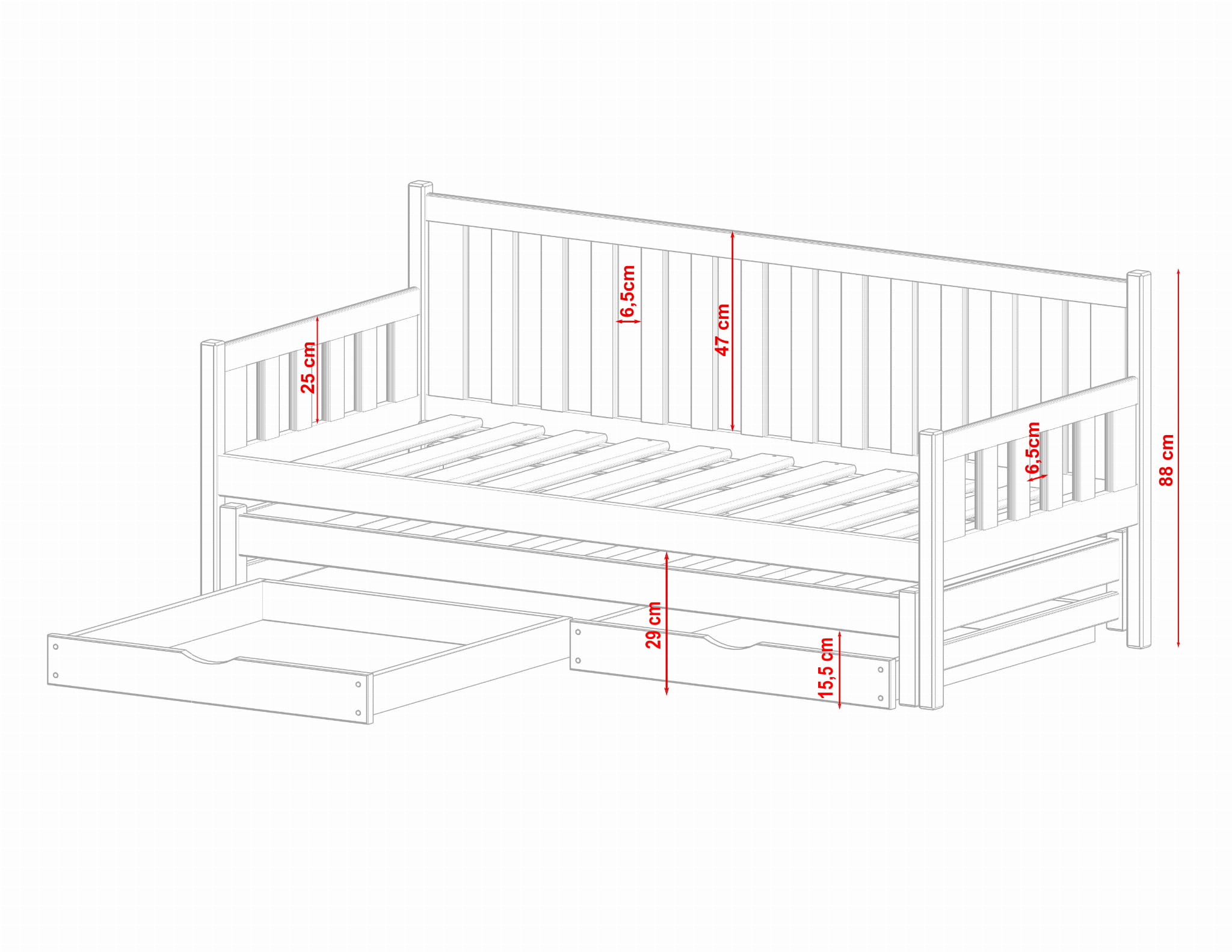 - Sängens totala höjd: 88 cm.