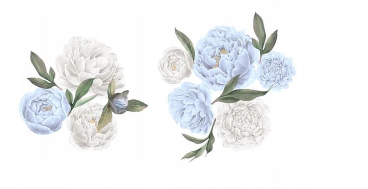 Et vakkert sett med veggklistremerker i form av vakre blå og hvite peoner.