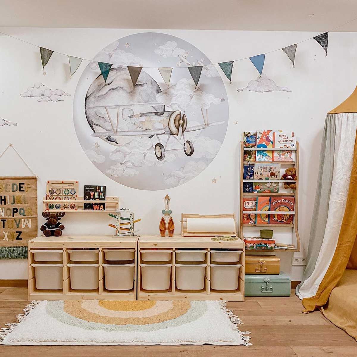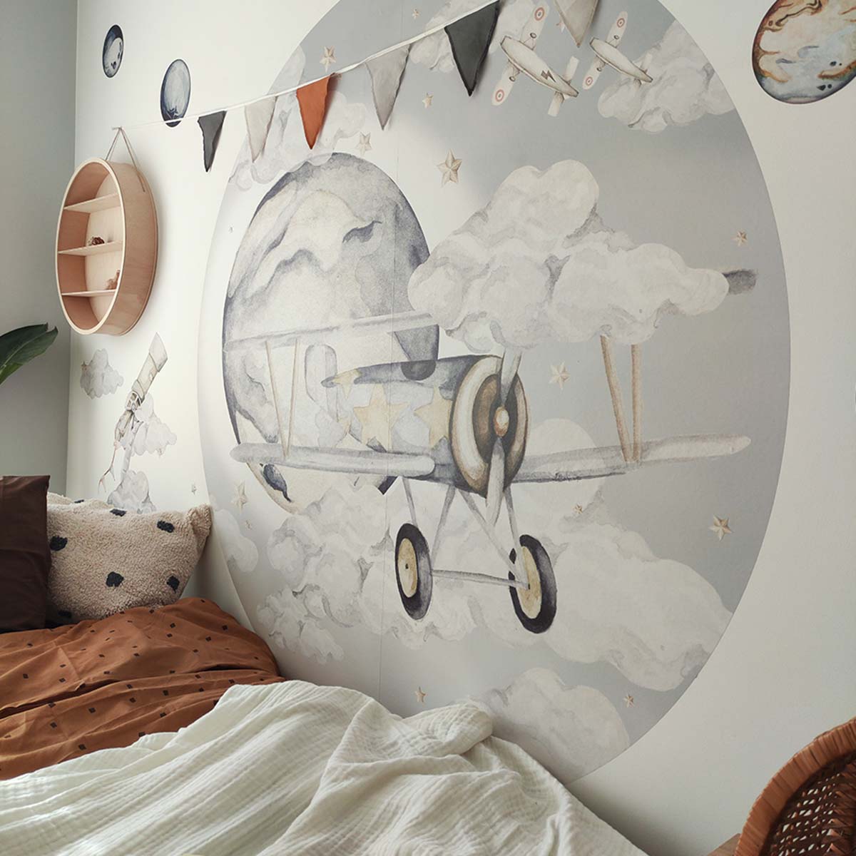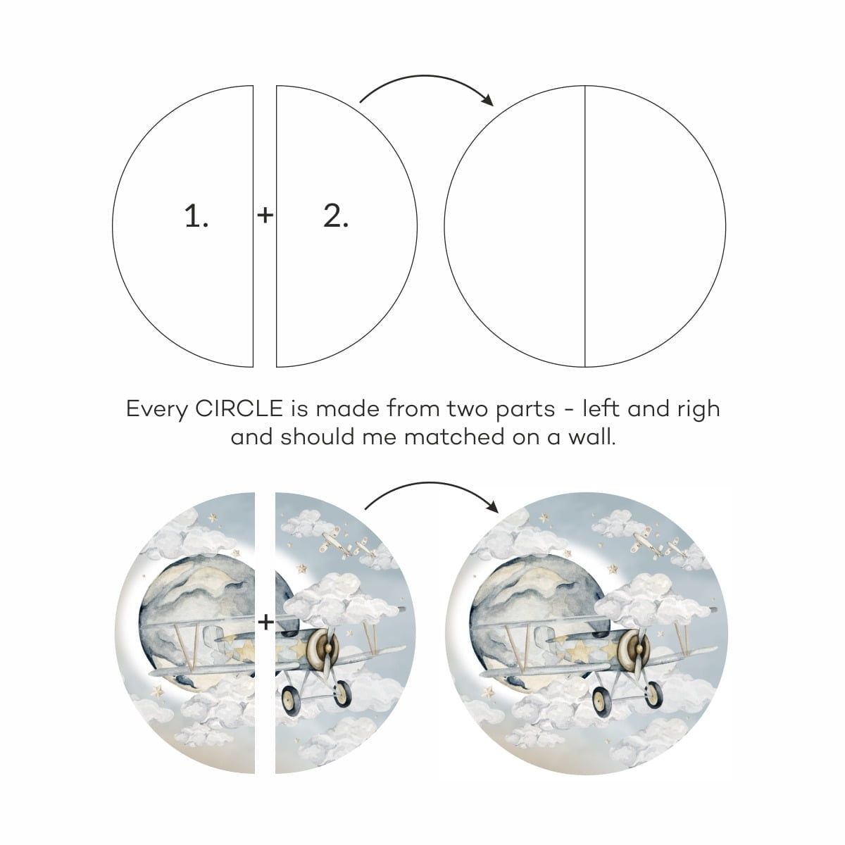 En underbar veggdekorasjon i form av et fly i en sirkel. Dette er en fantastisk måte å innrede barnerommet ditt på, da den passer like godt ved sengen som ved skrivebordet eller på en tom helvegg i stedet for tapet. \n \nVeggklistremerker er utformet for å se undervurdelige ut på både lyse og mørke vegger og har en fin struktur som knapt er merkbar. Materialet er spesielt utvalgt for å være sterkt og gi en perfekt fargegjengivelse. \n \nMål: Finnes i to størrelser \n