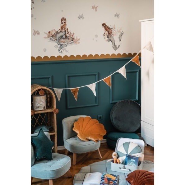 En fantastisk veggdekorasjon i form av vakre havfruer fra den nye kolleksjonen “Stories from the sea”.  Dette er en fantastisk måte å innrede barnerommet ditt på, da den passer både ved sengen, ved skrivebordet eller på en tom helvegg i stedet for tapet.