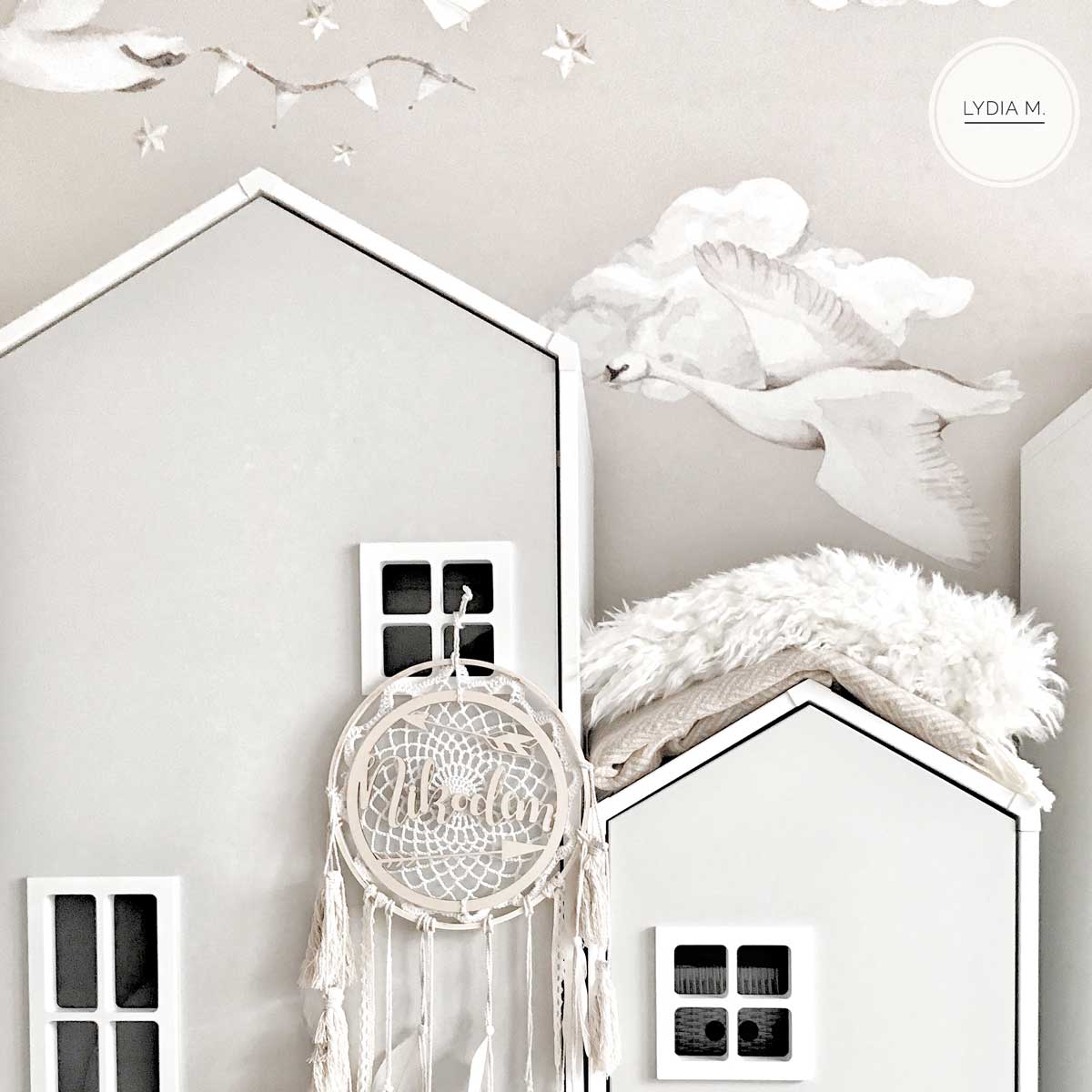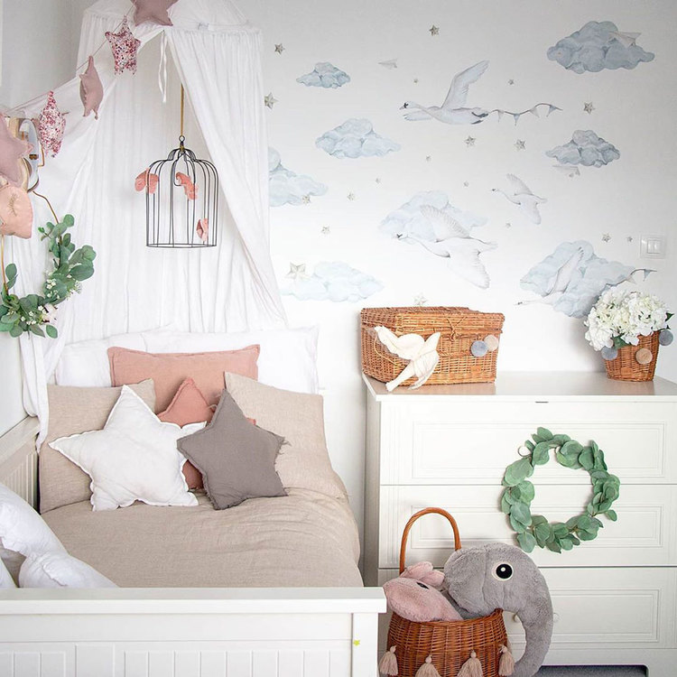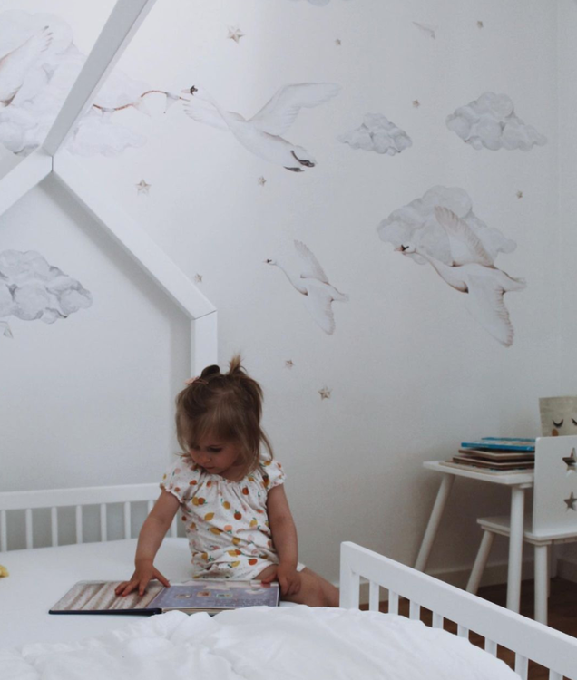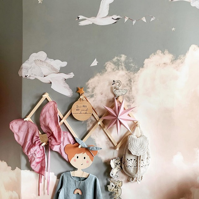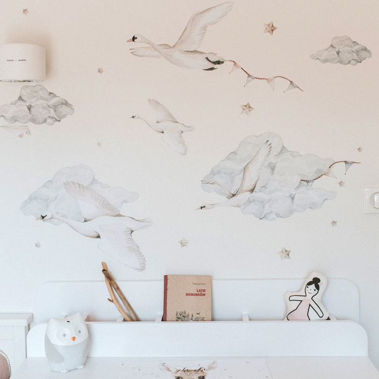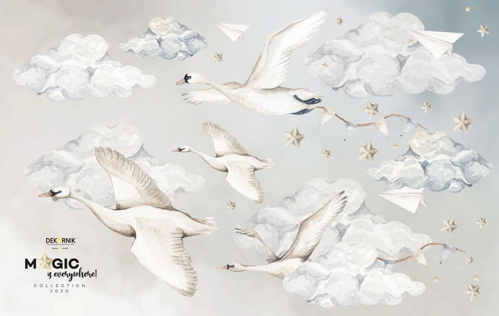En herlig veggdekorasjon i form av fine svaner med skyer fra den nye kolleksjonen “Magic is everywhere”.  Dette er en fantastisk måte å innrede barnerommet ditt på, da den passer like godt ved sengen som ved skrivebordet eller på en tom helvegg i stedet for tapet.