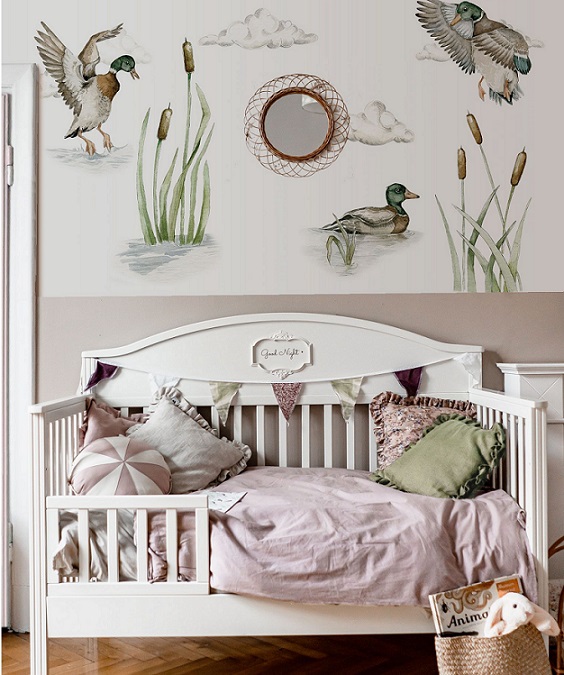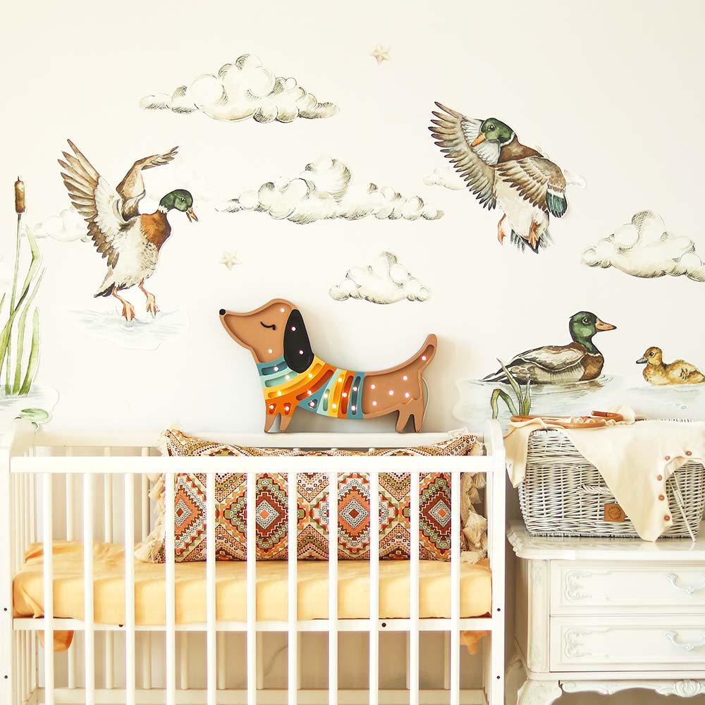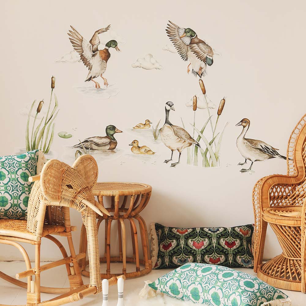 Et fantastisk motiv som du har mulighet til å innrede barnerommet ditt med for å skape et deilig og vakkert miljø. \n \n7 søte ender med tilhørende kvister og siv som skaper en egen magisk verden og som barnet ditt kommer til å elske og føle seg trygt med. \n \nDu monterer dem enkelt hver for seg. \n \nMål: Finnes i to størrelser \n
