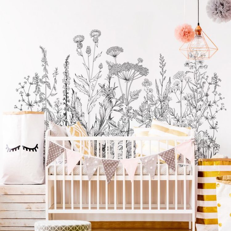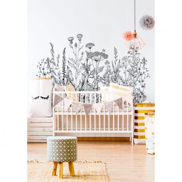 En meget vakker og herlig design inspirert av naturen og vakre blomsterenger. Dette unike veggklistermerkeet vil passe perfekt på en større vegg, bak en fin seng eller i barnets favorittlekehjørne.
