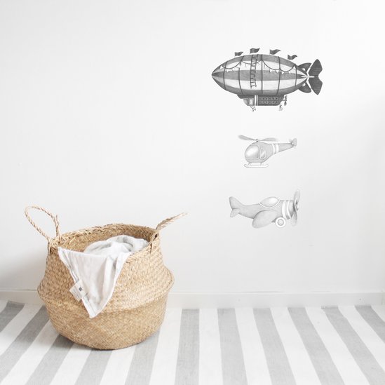 Fly av sted lysegrå veggklistremerker, Stickstay \n \nMed disse utrolig populære veggklistremerkene vil du kunne skape et levende og fantasifullt barnerom som barnet ditt kommer til å elske. Settet inneholder tre stykker vakre veggklistremerker som du kan skape dine egne kombinasjoner av. Du kan selvfølgelig også med fordel kombinere dem med andre motiver fra Stickstays brede utvalg, og dermed skape ditt helt unike barnerom. \n \nAlle veggdekorasjoner fra Stickstay er laget av kraftig vinyl og av høyeste kvalitet, noe som gjør at du enkelt kan flytte dem rundt til nye steder i rommet. Alle motivene er håndskissert av Lisa Flodmark. \n \nDu kan enkelt montere disse veggklistremerkene på de fleste typer underlag som malte tapeter eller vegger. Du bør likevel alltid følge instruksjonene på emballasjen og være ekstra nøye på litt tynnere tapeter. \n \nSettet omfatter 1 zeppelin, 1 fly og 1 helikopter som er i størrelsene 14 til 29 cm. \n \nMateriale: Vinylplast ( Resirkulerbar ) \n \nDesigner: Stickstay \n \n