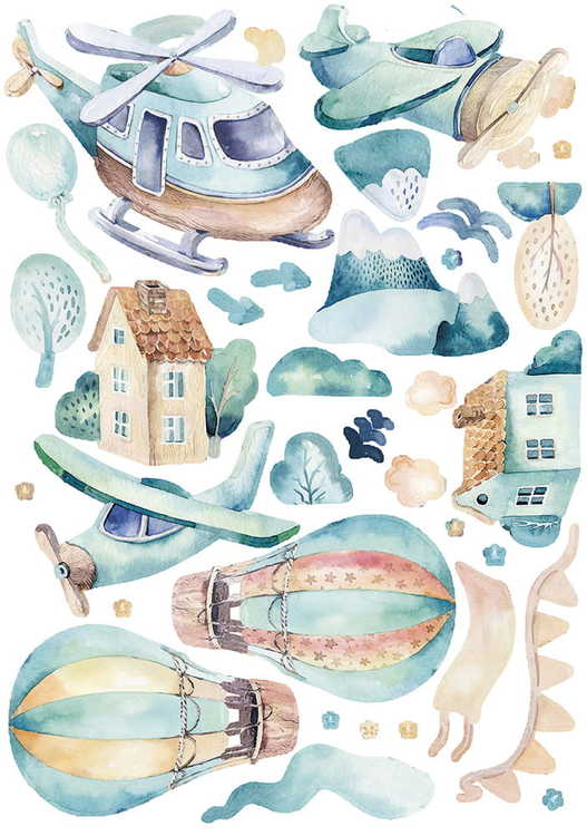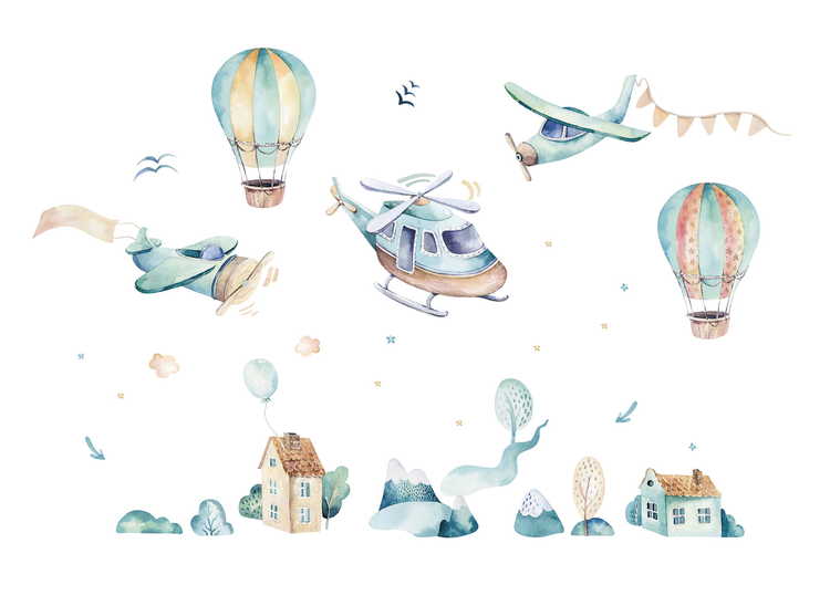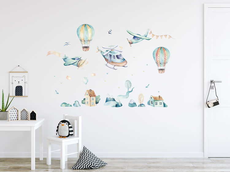 Et vakkert sett med veggklistremerker i form av en by med helikopter, fly og luftballonger.