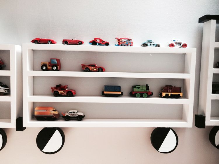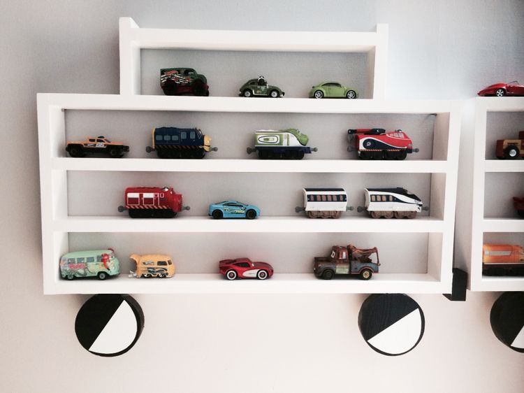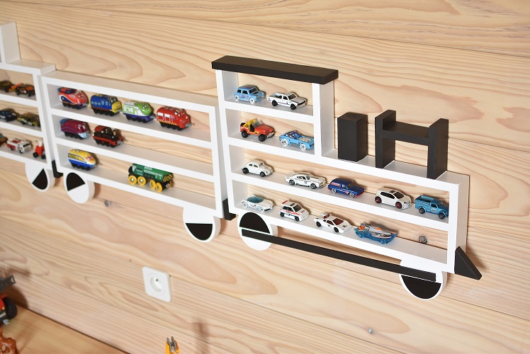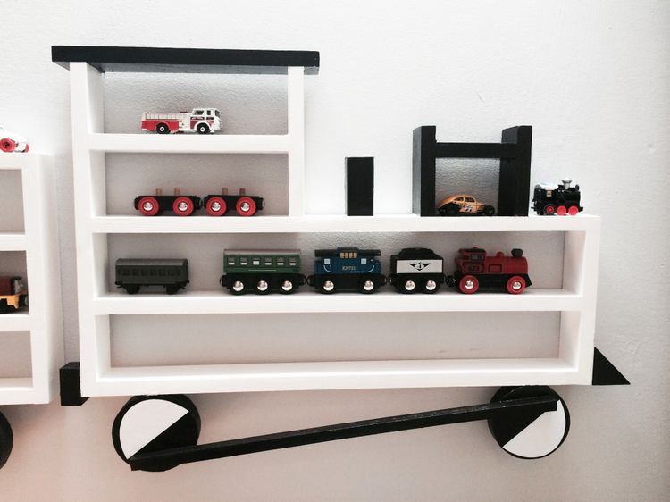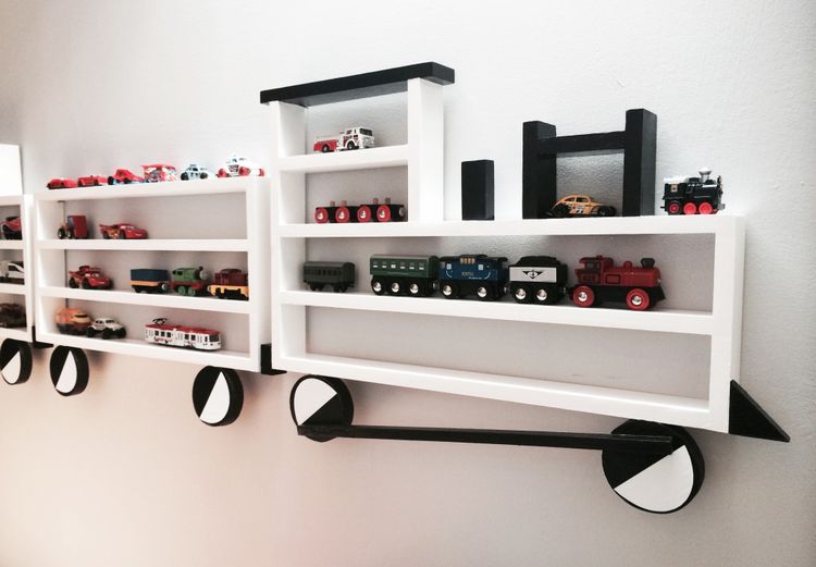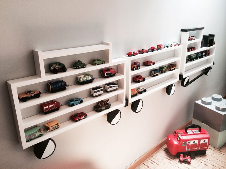 En eksepsjonell hylle i form av et tog med lok og to vogner. En perfekt hylle å oppbevare lekebiler og tog på, meget verdsatt av alle barn. \n \nMål: Bredde, ca 150 cm. Høyde, ca 45 cm. Dybde ca 5 cm. Høyden på hyllene er ca 6 cm. \n \nMalt med barnesikre farger. \n \nHyllen festes på veggen ved å montere spesialtilpassede hengere som man deretter henger opp toghyllen på. Disse hengerne er inkludert i prisen.