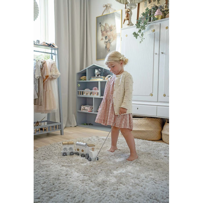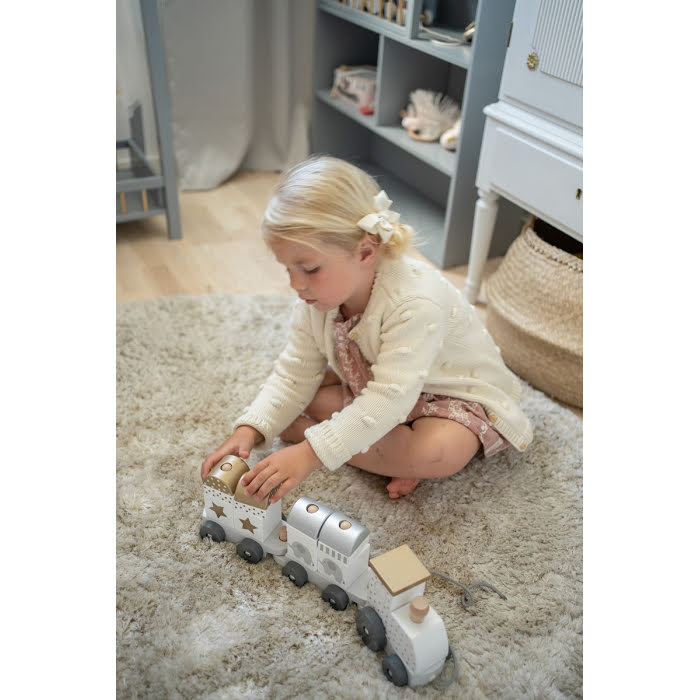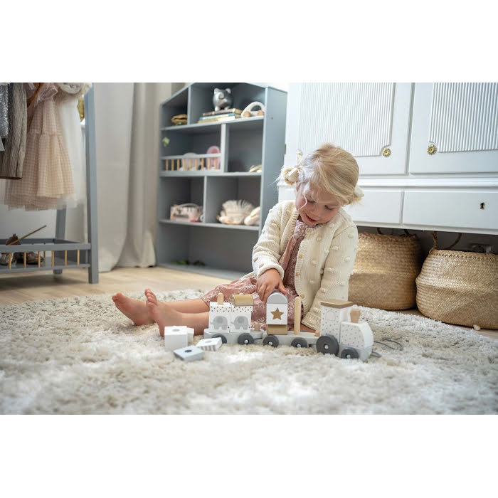 Søt treleke i form av et tog med stablbare klosser fra svenske Jabadabado. Bedre leke enn det er vanskelig å finne! Dessuten er den meget vakker og kommer i en fin gaveemballasje.