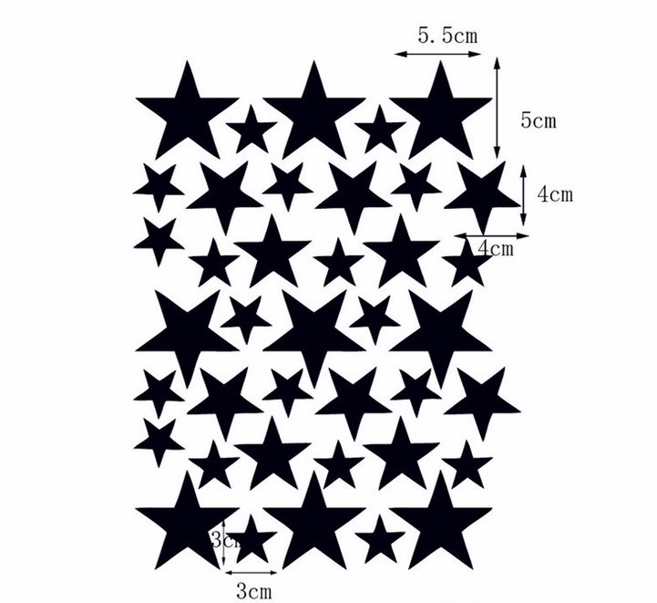 Størrelse: Pakkene  kommer i sett av tre forskjellige størrelser av stjerner: liten 3 cm x 3 cm, mellom 4 cm x 4 cm, stor 5,5 cm x 5 cm. Totalt  39 stk. stjerner.