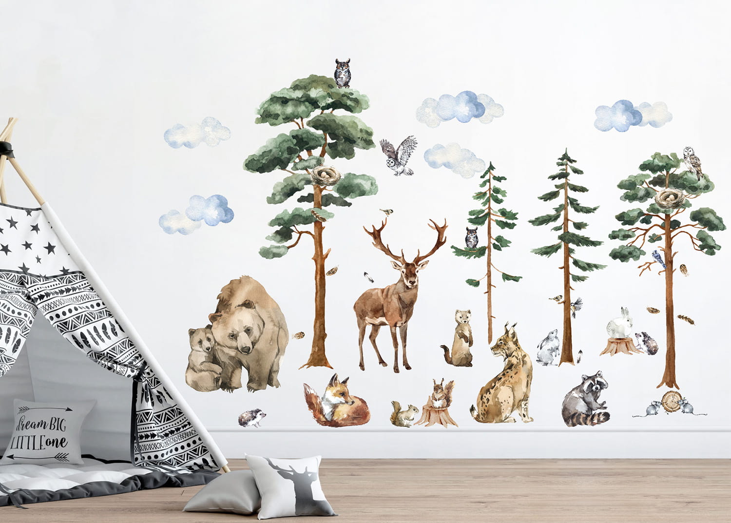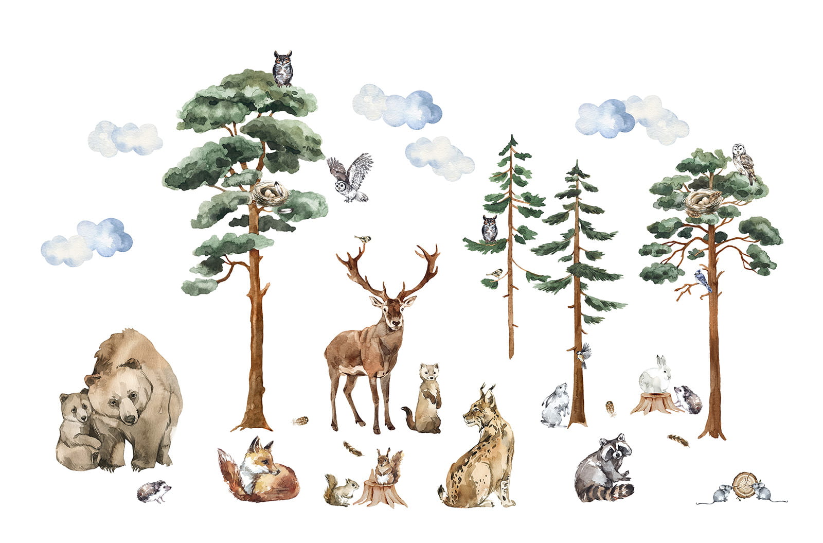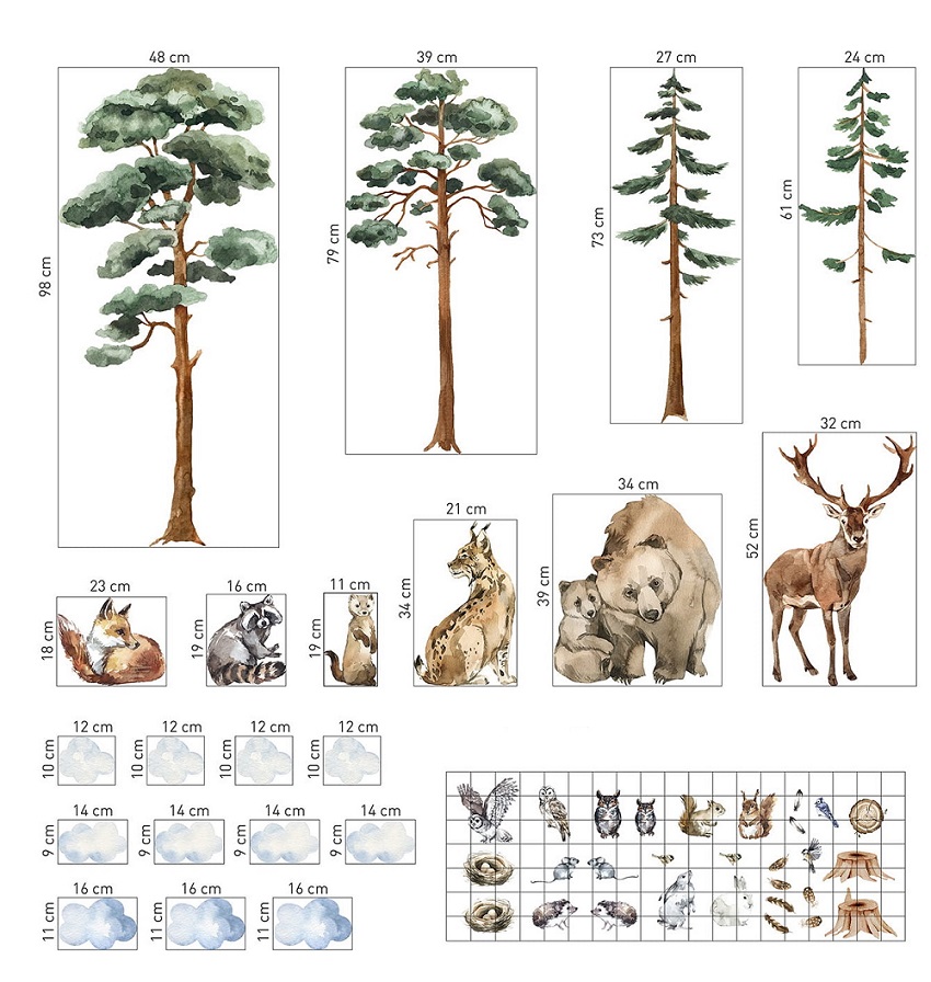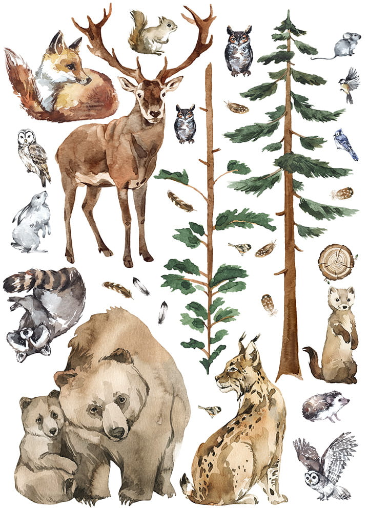 Et vakkert sett med veggklistremerker i form av morsomme skogsdyr og trær.