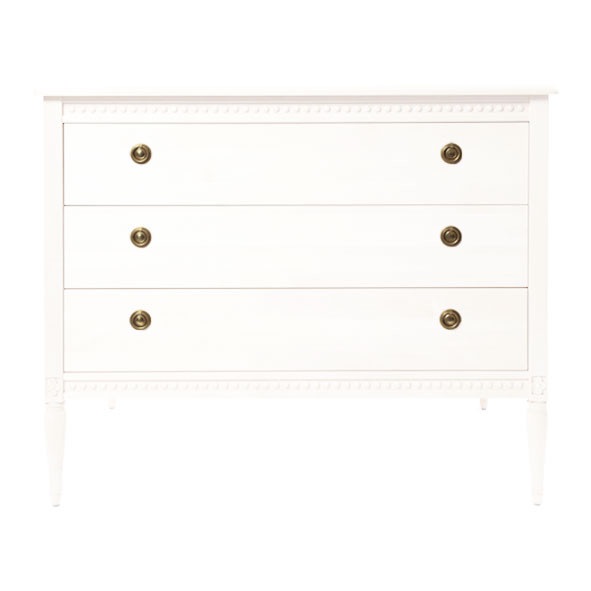 En otroligt lyxig byrå i gustaviansk stil till barnrummet! De vackra dekorativa detaljerna skapar en extra charm och kommer att lyfta din barnrumsinredning till himmelska höjder. Byrån har tre rymliga lådor där barnet kan förvara sina kläder, spel eller böcker. Finns i tre klassiska färger: natur, vit och grön.Mått: Längd 101 cm. Bredd 73 cm. Höjd 90 cm.Material: Byrå: björk…