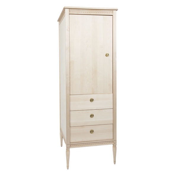 Garderoben har ett stort förvaringsutrymme med klädstång och två avtagbara hyllor samt 3 förvaringslådor undertill. Passar perfekt i de minsta barnrummen tack vare sin smala bredd.