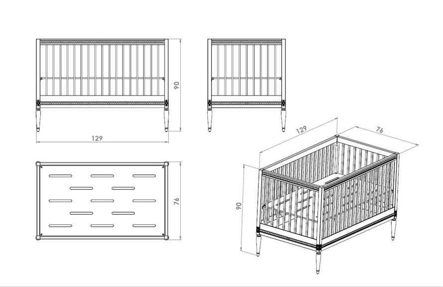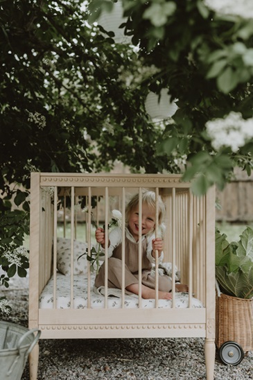 Den här fina spjälsängen kan anpassas efter barnets utvecklingsfaser, bland annat genom två nivåer på sängbotten. Kan därmed användas från födsel till småbarnsåldern. Spjälorna på framsidan kan tas bort för att omvandla spjälsängen till en soffa.