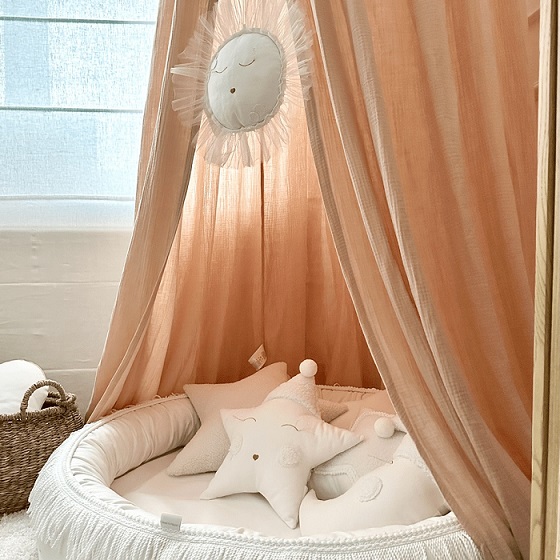En mycket charmig och vacker aprikosfärgad sänghimmel tillverkad av högkvalitativ bomull. Designad i en enkel form och i en typisk skandinavisk stil. I varje rum som denna används kommer en sagokänsla att spridas. Perfekt för att inreda barnrummet på ett bra sätt. Sänghimmeln är dessutom förberedd med en praktisk anordning i mitten för att kunna hänga favoritsakerna.