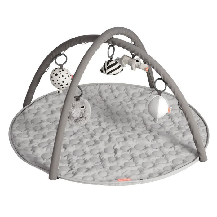 Denna babygym/lekmatta från Done by Deer inkluderar en mysig filt och fem olka leksaker för aktivering. Leksakerna kan hängas I totalt 13 olika positioner på valven ovan mattan.