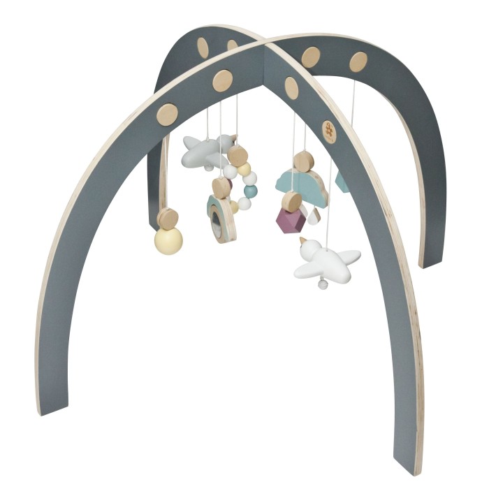 Detta babygym i dansk design från Sebra är helt gjort i trä och med formen av en båge som är tänkt att skapa en trygg atmosfär runt barnet. Babygymet är framtaget helt efter barnets behov och förutsättningar, detta för att stimulera såväl motorik som lärande, samtidigt som barnet har roligt och leker. I babygymmets båge hänger åtta sensoriska leksaker som ditt barn kan försöka att nå och greppa. Leksakerna har olika färg och form för att ge barnet flera intryck.