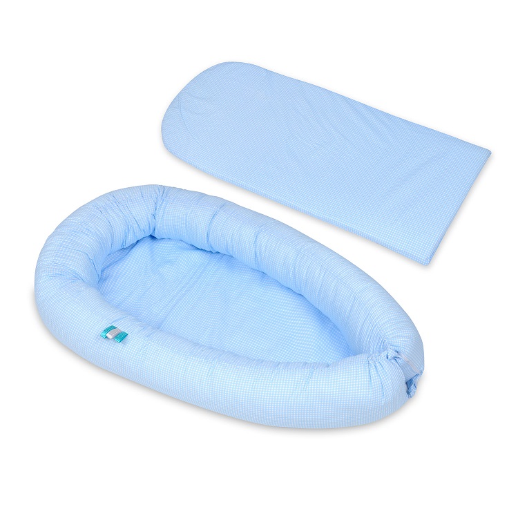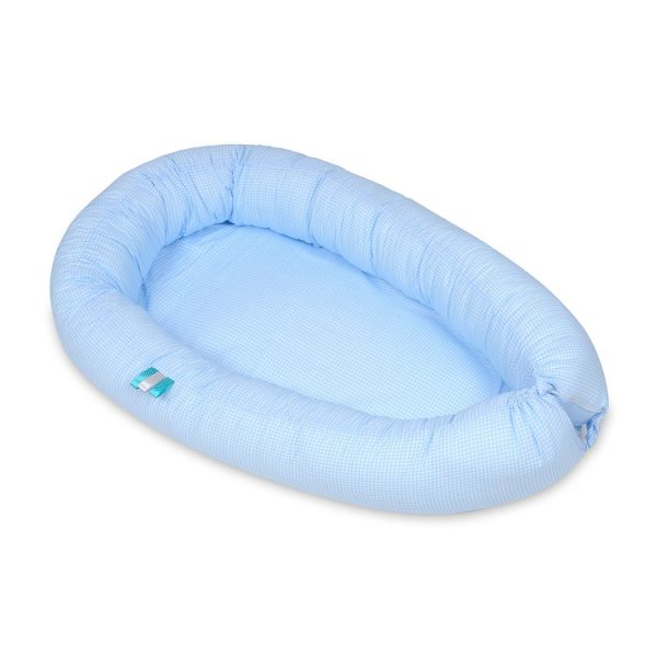 Mysigt babynest i ett blå rutmönster.  Nestet fungerar både som säng och skötbädd och passar perfekt att ta med sig på resan. En supermjuk fyllning gör att din baby ligger tryggt och bekvämt. Babynest öppnas och stängs enkelt med hjälp av knytsnören och kan även användas som en insats i spjälsängen eller barnvagnen.
