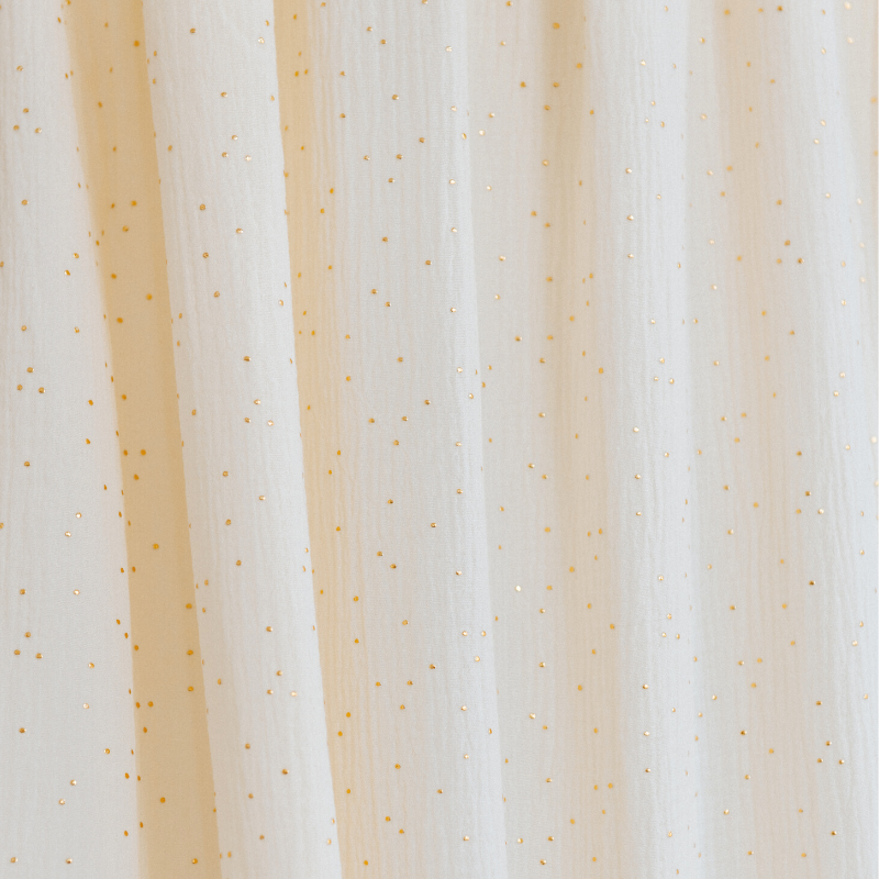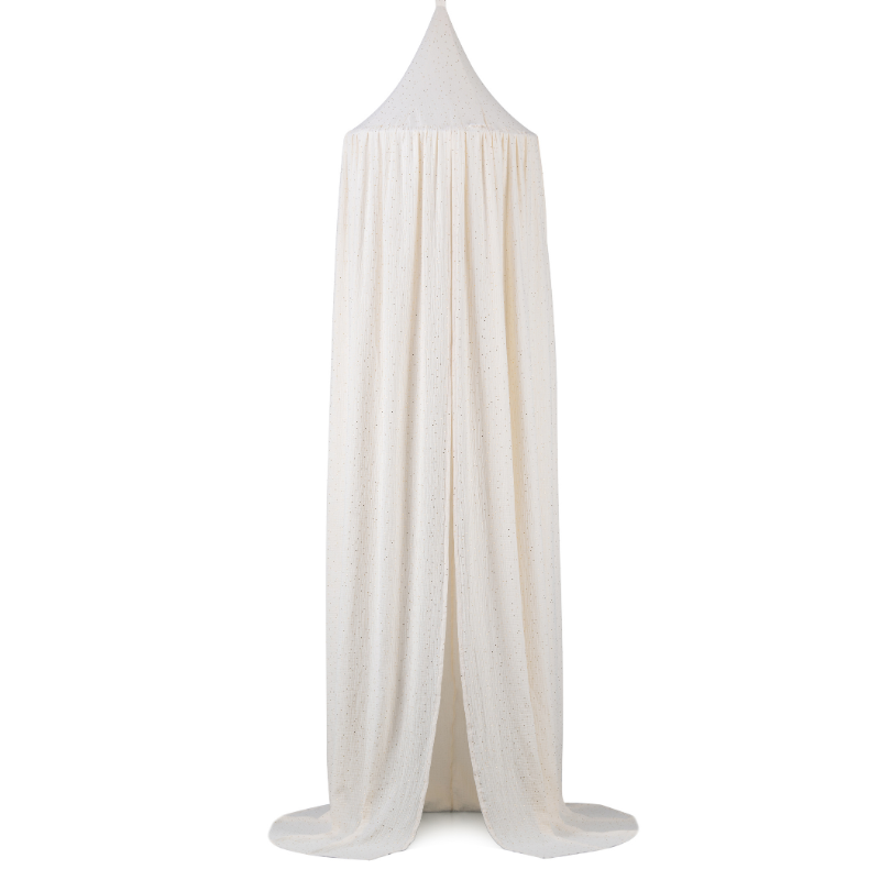 En underbar sänghimmel med guldiga prickar i mjuk bomullsmuslin från egna och unika kollektion gjord av högsta kvalitet. Tillverkad i vår egna fabrik i Europa, och vi har samlat alla våra kunskaper kring sänghimlar för att skapa den mest prisvärda kvalitetsprodukten på marknaden.