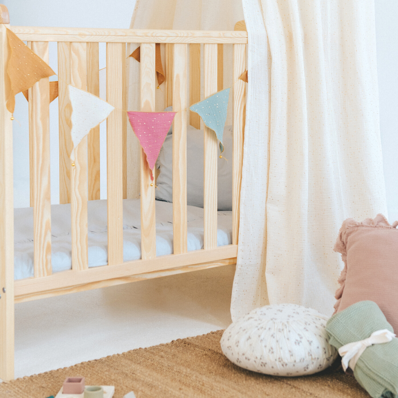 Material: Sänghimmeln är tillverkad av 100 % OEKO TEX certifierad bomullsmuslin från Frankrike, och med omtanke om barnet som signum. Produktionen är helt giftfri och sänghimmeln är handsydd styckevis, du kommer att älska den, det är vi säkra på. Bomullen andas och är anpassad för att inte ge för ”tung” känsla när den är upphängd.