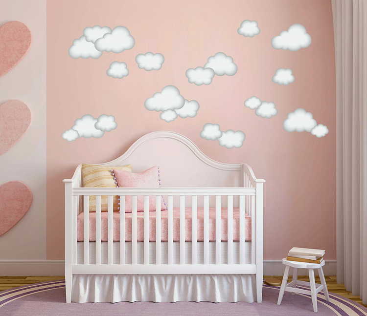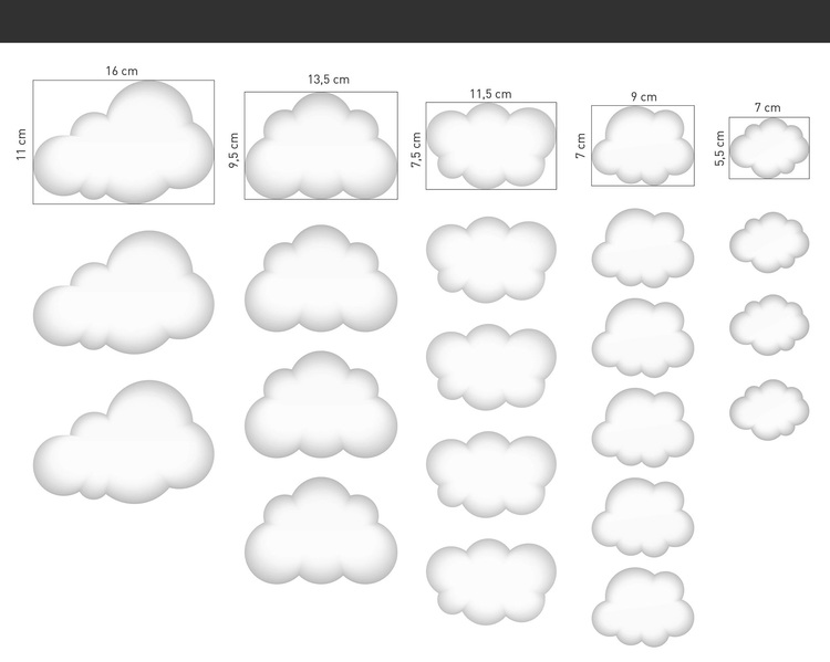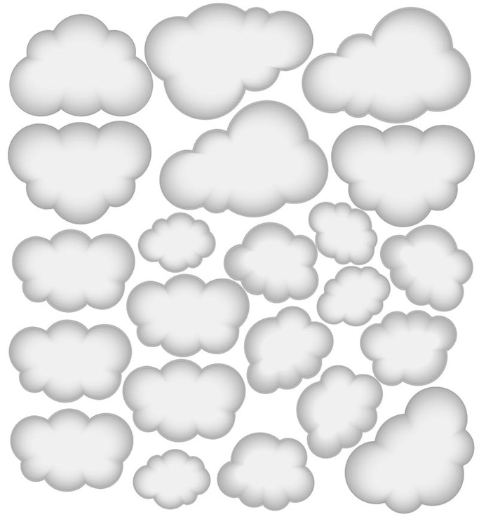 Mått: Varje moln cirka 10-12 cm x 8-12 cm. Setet innehåller 22 väggklistermärken.