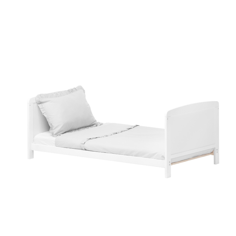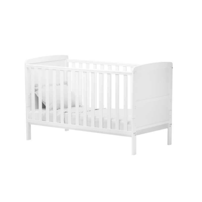 En klassisk vit spjälsäng som växer tillsammans med barnet och förvandlas enkelt från spjälsäng till juniorsäng genom att skruva ner långsidorna så den blir en fin barnsoffa eller juniorsäng.