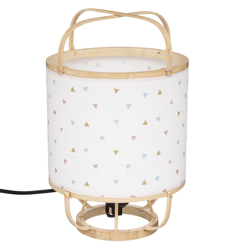 En underbar bordslampa som kommer att ge barnrummet en speciell myscharm. Vackra triangelmönster pryder den vita lampskärmen i tyg. Armaturen är gjord i bambu.Mått: Diameter: 17 cm. Höjd: 27 cm. Material: Bambu och polyester.