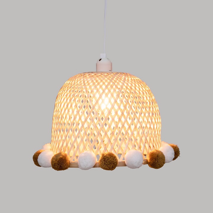 Underbar taklampa i bambu med söta pompom som kommer att ge barnrummet en speciell charm.Oerhört detaljrik lampa som kommer bidra mycket till din barnrumsinredning.Mått: 28 x 20 cm. Kabellängd: 80 cm.Material: Bambu och polyester. Obs! Lampropp medföljer ej, men kan införskaffas hos Ikea, Bauhaus etc.