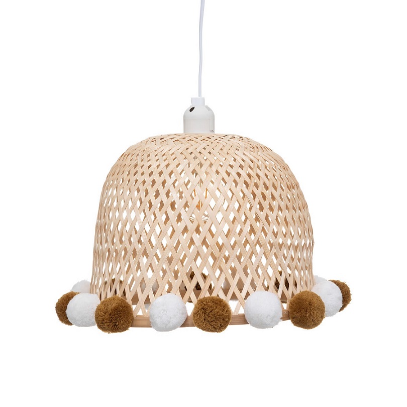 Underbar taklampa i bambu med söta pompom som kommer att ge barnrummet en speciell charm.
