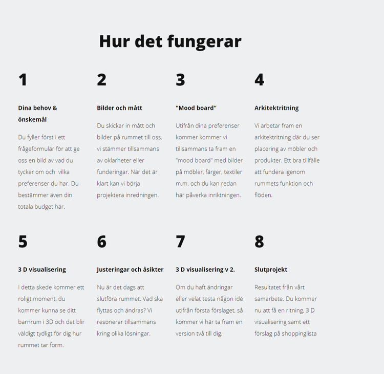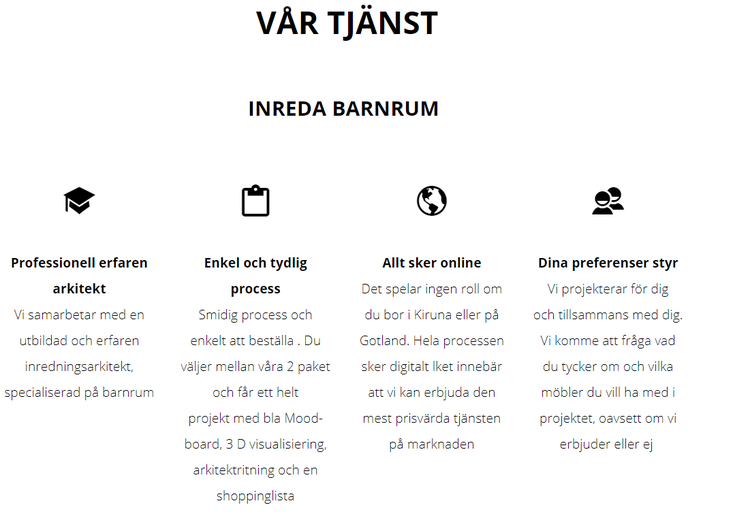 En professionell och licensierad inredningsarkitekt skapar ett unikt projekt för ditt barnrum , oavsett vart du bor. Processen sker helt och hållet online och du kommer att kunna följa arbetet med barnrummet under hela resan genom arkitektritningar och 3-D skisser.