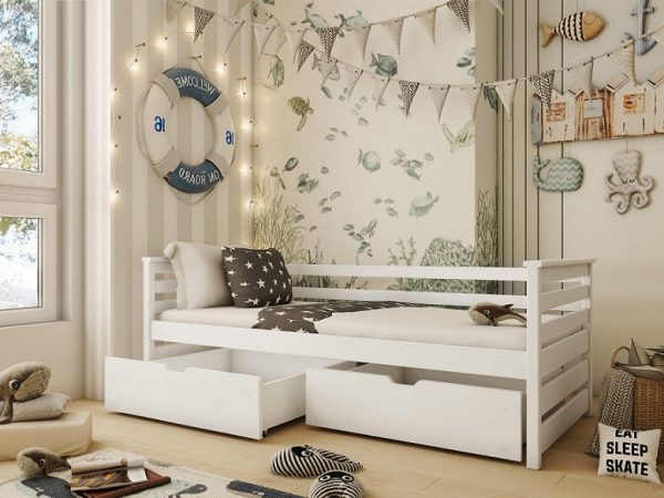 En säng i skandinavisk stilren stil som passar överallt och i alla typer av rum. Du kan enkelt dekorera den med fina vimplar eller ljusslingor för att få mer effekt.