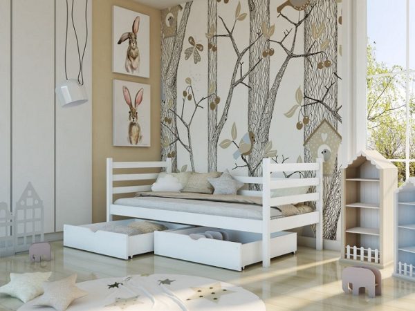 En säng i skandinavisk stilren stil som passar överallt och i alla typer av rum. Du kan enkelt dekorera den med fina vimplar eller ljusslingor för att få mer effekt.