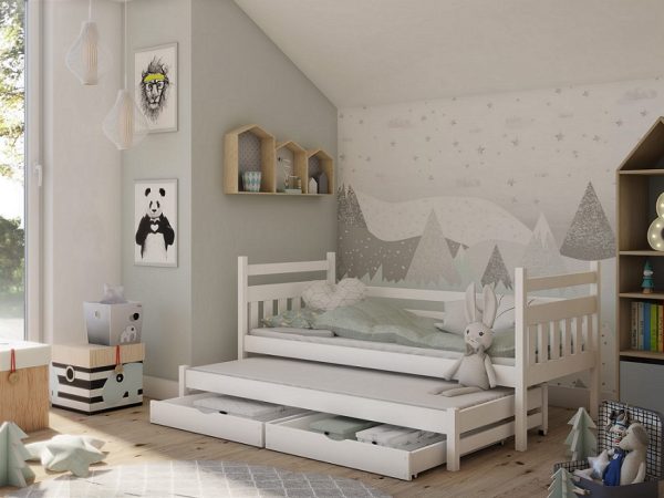En fantastiskt fin barnsäng med en praktisk extrasäng undertill som du enkelt tar fram vid behov. Perfekt som en syskonsäng eller om en kompis vill sova över. Sängen kan även användas som en dagbädd eller kökssoffa.