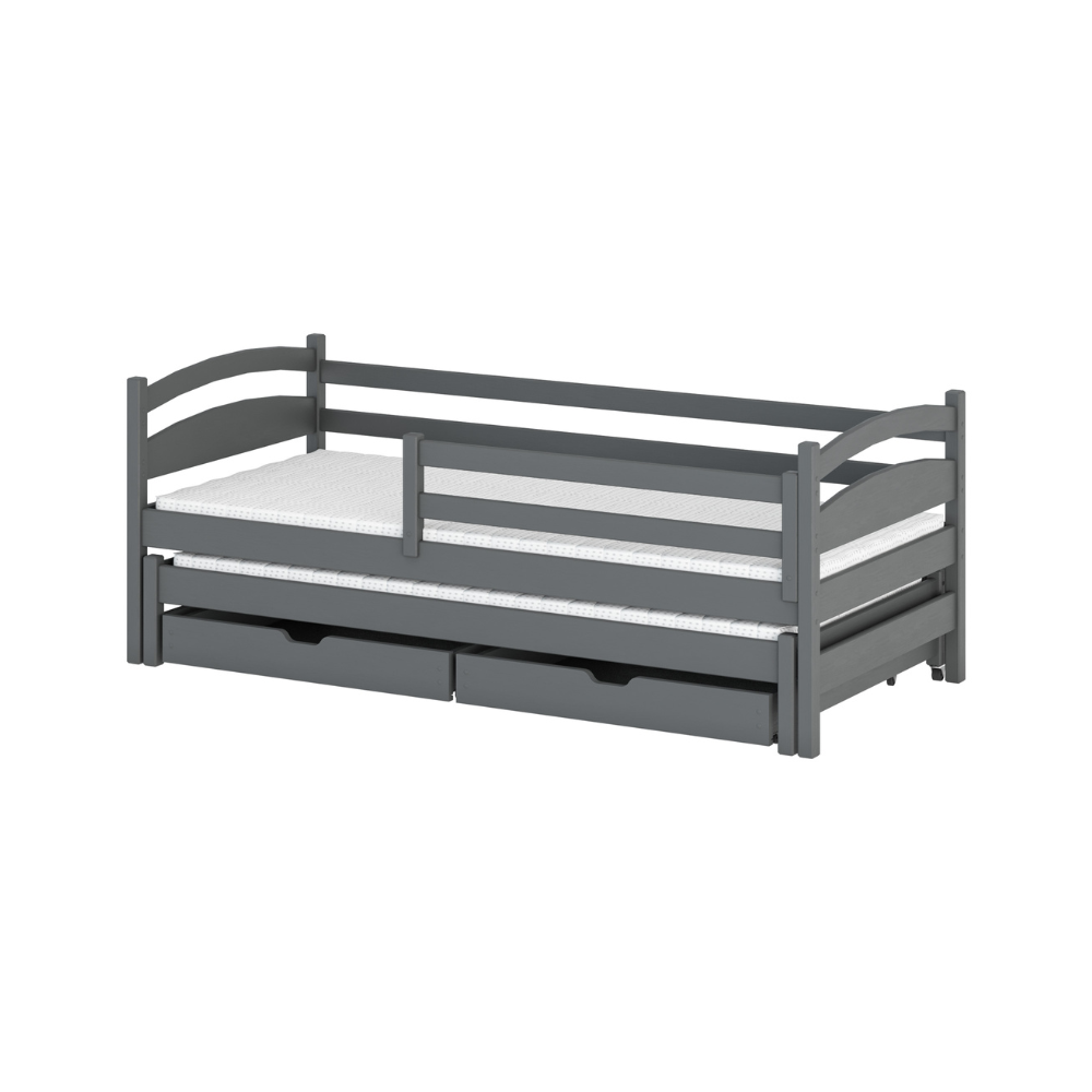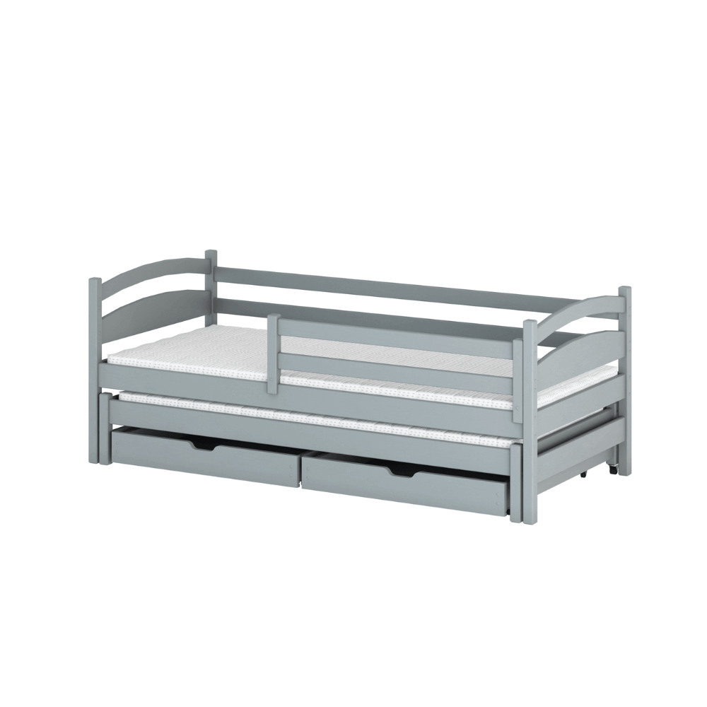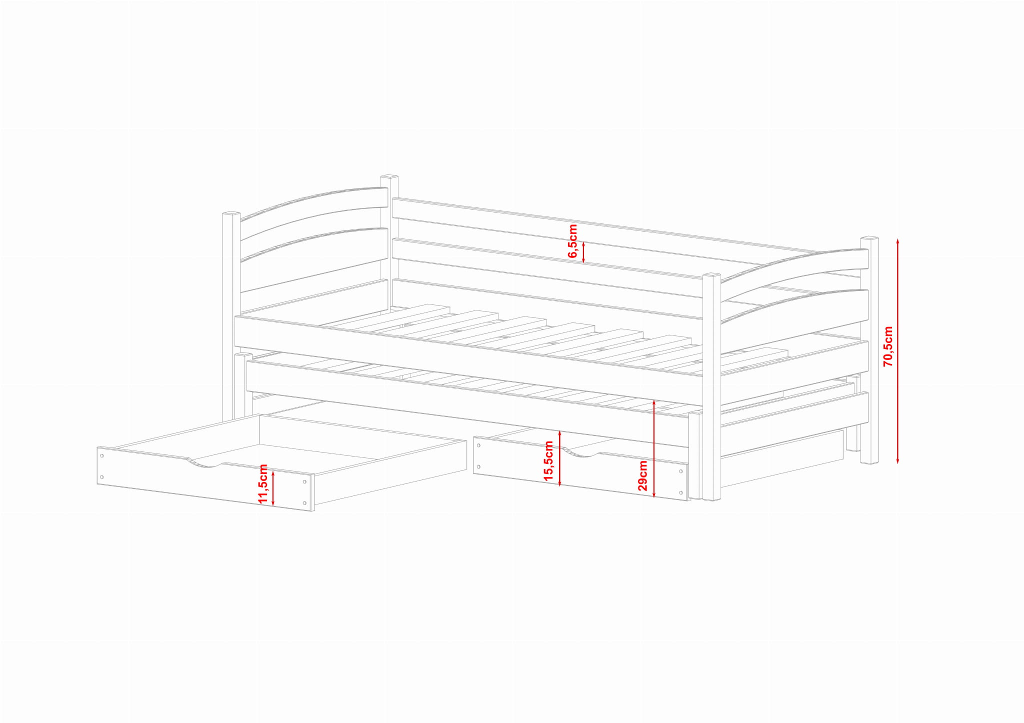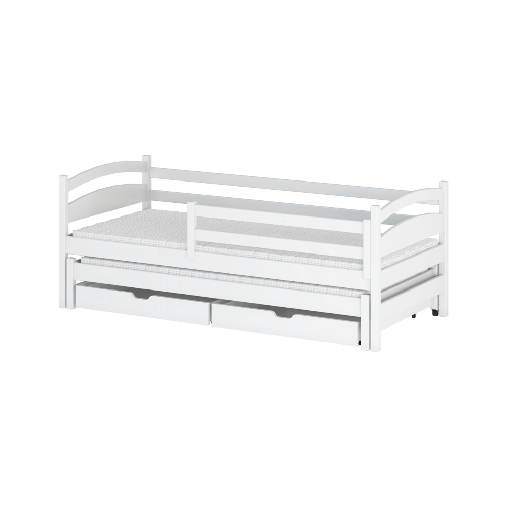 En fantastiskt fin barnsäng med en praktisk extrasäng undertill som du enkelt tar fram vid behov. Perfekt som en syskonsäng eller om en kompis vill sova över. Stödbrädan är avtagbar och sängen kan även användas som en dagbädd eller kökssoffa. Sängen är låg och får plats där det är lågt i tak, till exempel under snedtak.