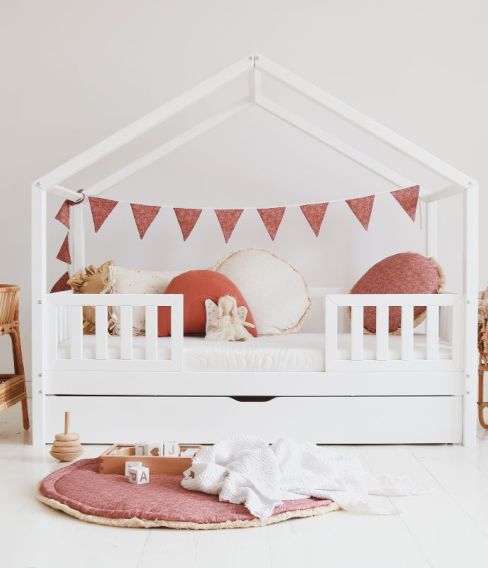 En säng i skandinavisk stilren stil som passar överallt och i alla typer av rum. Du kan enkelt dekorera den med fina vimplar eller ljusslingor för att få mer effekt.