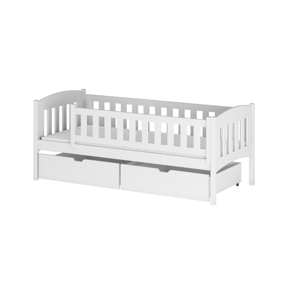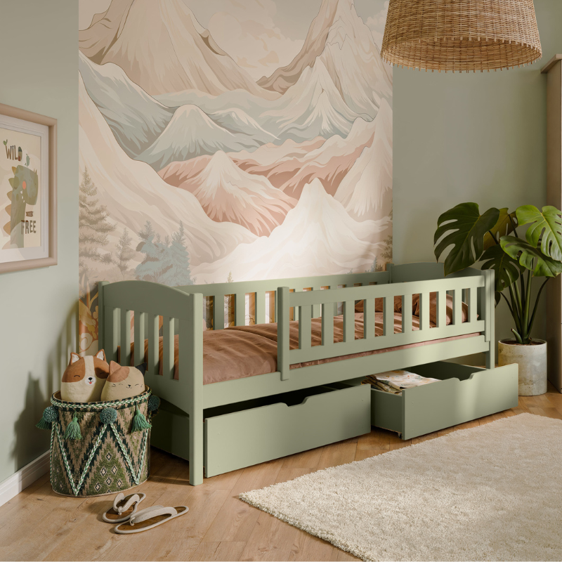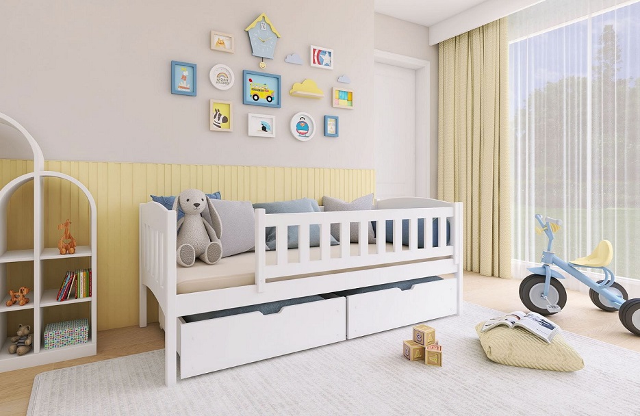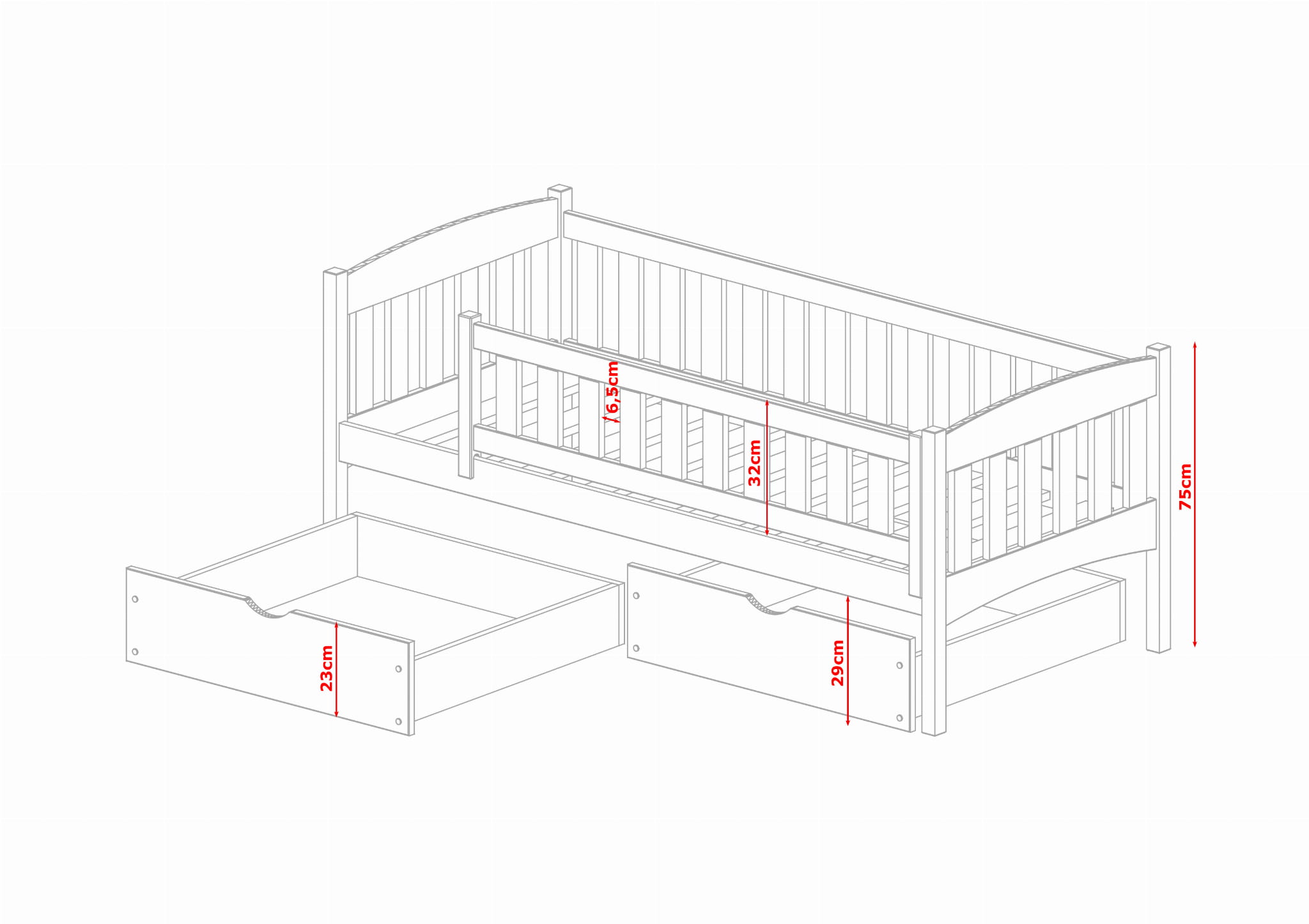 Den stora fördelen med denna modell är de det höga och långa räcket som gör att den passar utmärkt till de mindre barnen! Stödbrädan är avtagbar och sängen kan även användas som en dagbädd eller kökssoffa när barn blivit större.