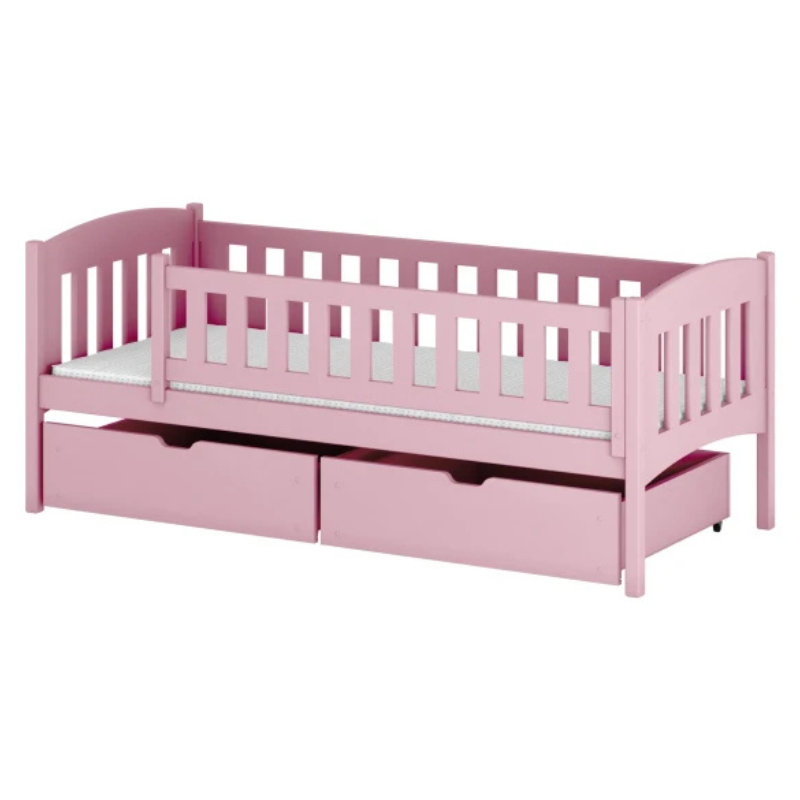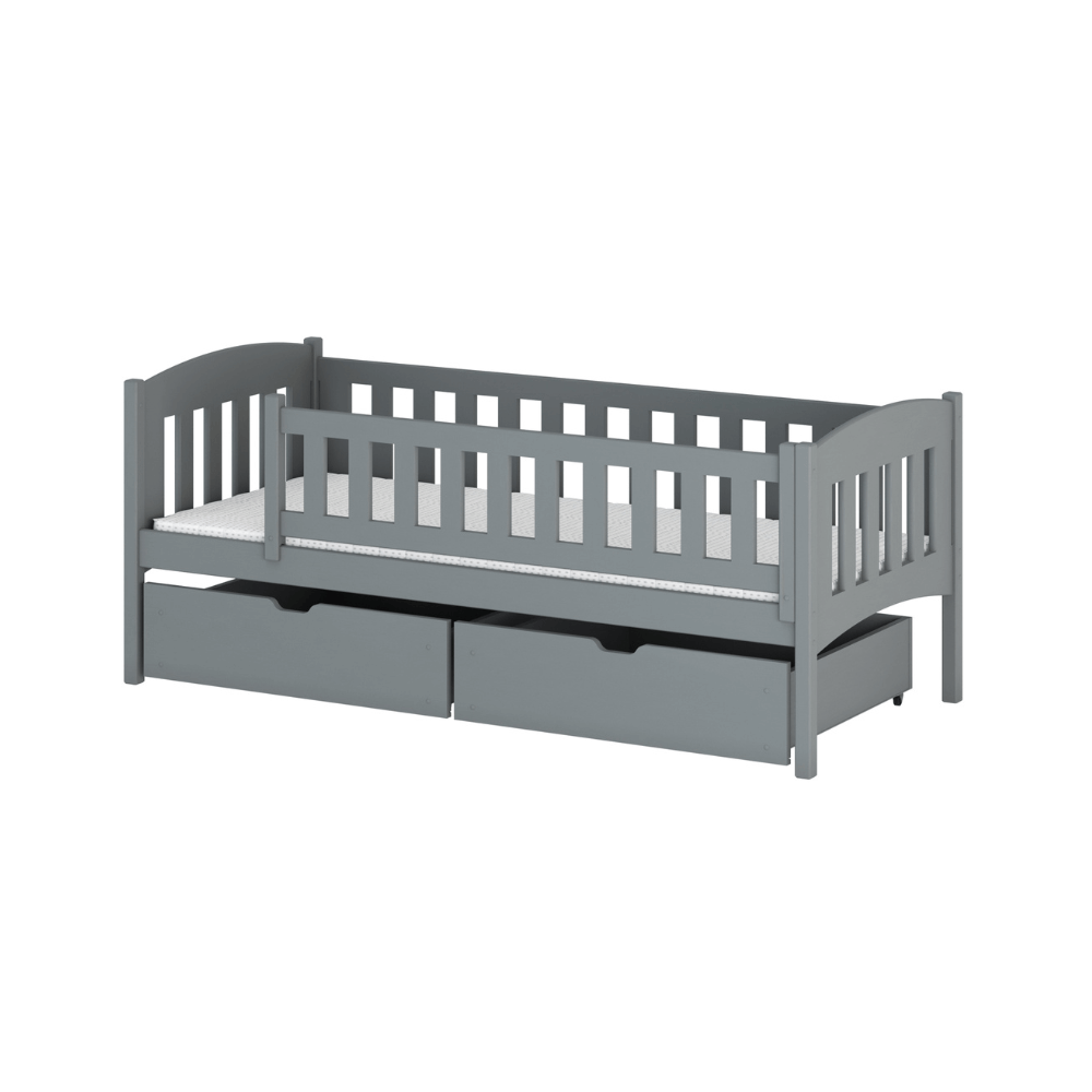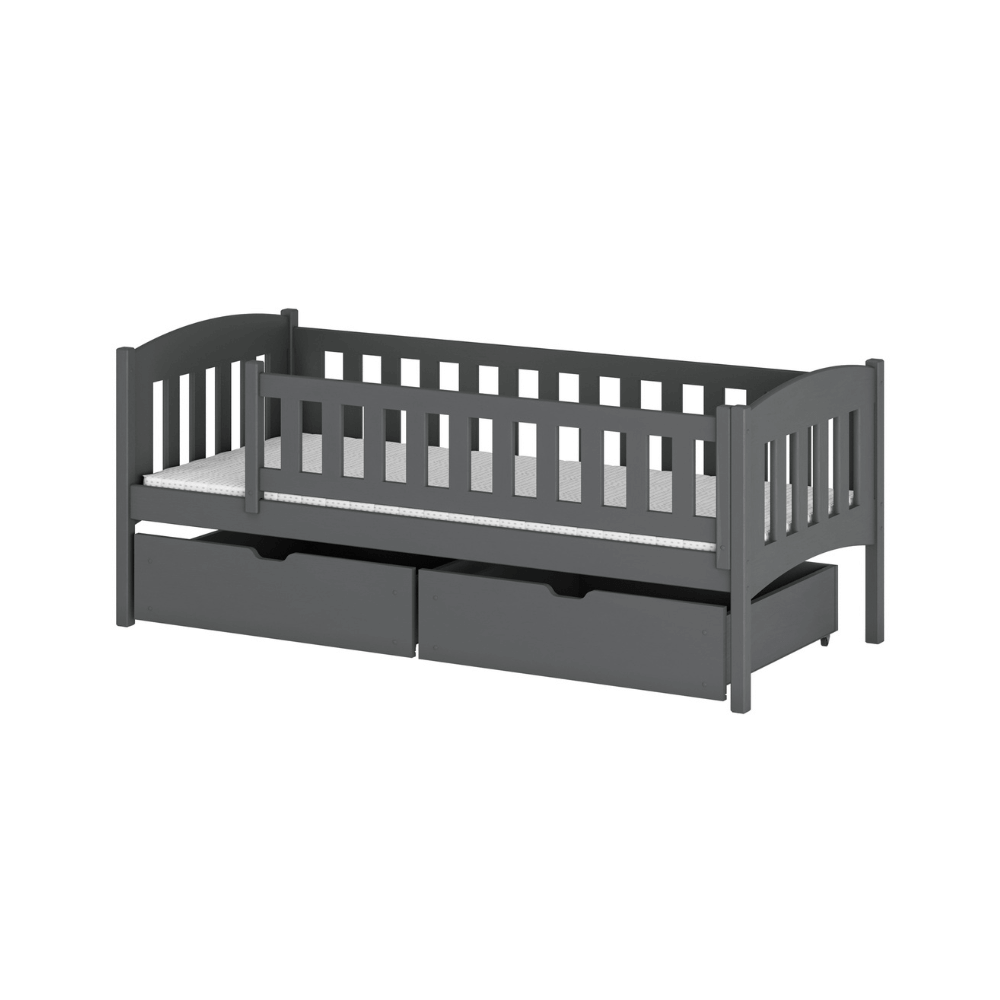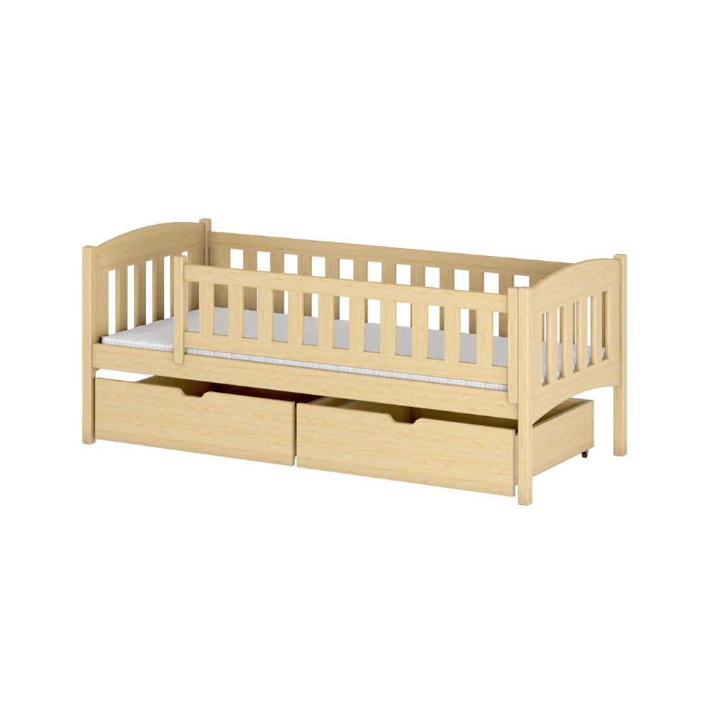 Den stora fördelen med denna modell är de det höga och långa räcket som gör att den passar utmärkt till de mindre barnen! Stödbrädan är avtagbar och sängen kan även användas som en dagbädd eller kökssoffa när barn blivit större.