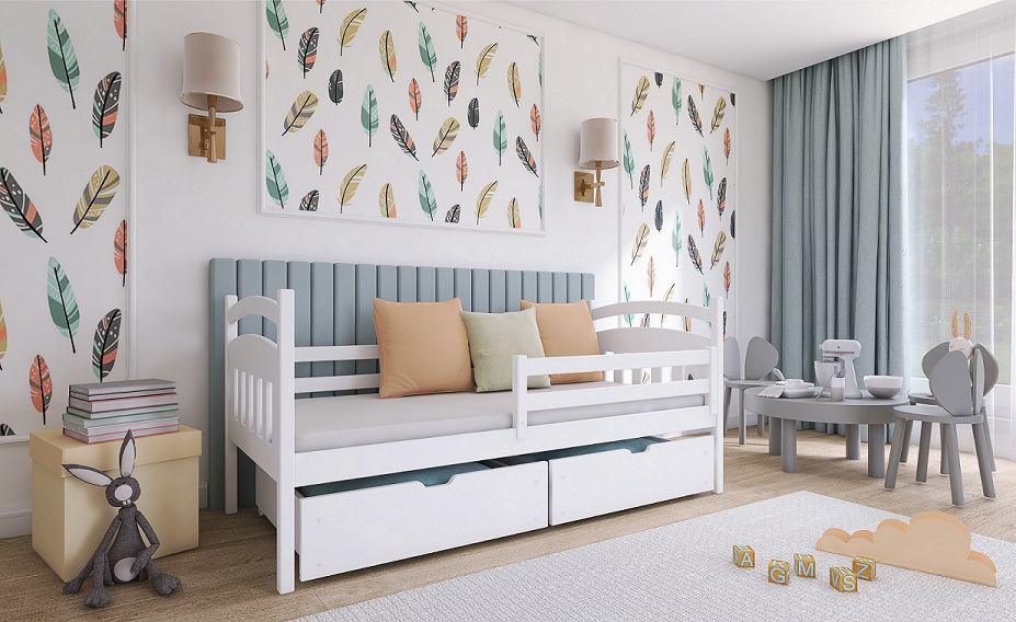 En säng i skandinavisk stilren stil som passar överallt och i alla typer av rum. Du kan enkelt dekorera den med fina vimplar eller ljusslingor för att få mer effekt.