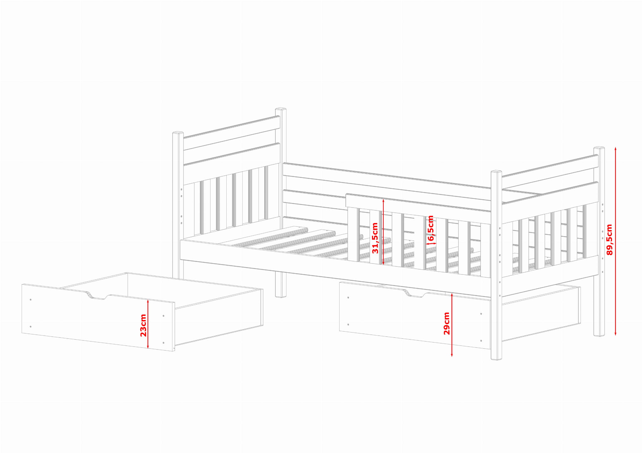 - Stödbräda höjd när den är monterad: 31,5 cm. Avstånd mellan spjälor 6,5 cm.