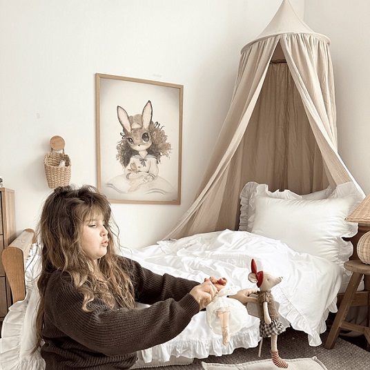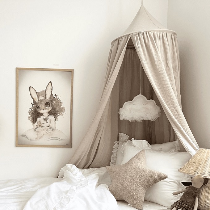 En mycket charmig och vacker beige sänghimmel tillverkad av högkvalitativ bomull. Designad i en enkel form och i en typisk skandinavisk stil. I varje rum som denna används kommer en sagokänsla att spridas. Perfekt för att inreda barnrummet på ett bra sätt. Sänghimmeln är dessutom förberedd med en praktisk anordning i mitten för att kunna hänga favoritsakerna.