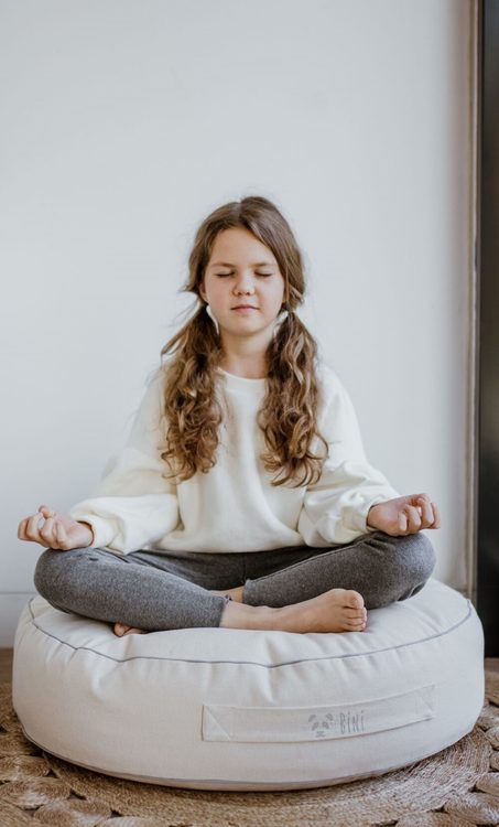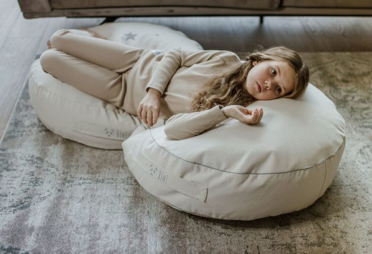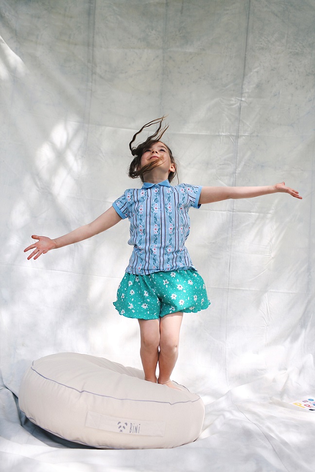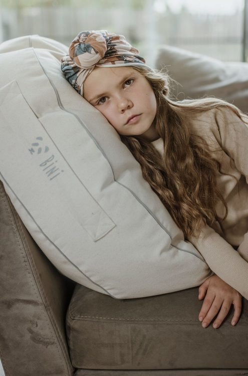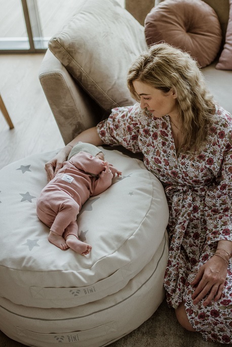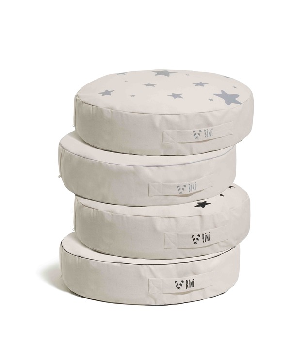 Bini är en mycket skön sittpuff som har designats med stor omsorg, för att ditt barn ska kunna sitta på den, ligga på den eller även leka på den. Den är gjord av organisk foglig bomull, som är mycket behaglig och skön. Den görs för hand i Europa och materialet har inte utsatts för några kemiska processer och innehåller inget silikon. Trycket är vattenbaserat med en speciell screen-tryck metod.
