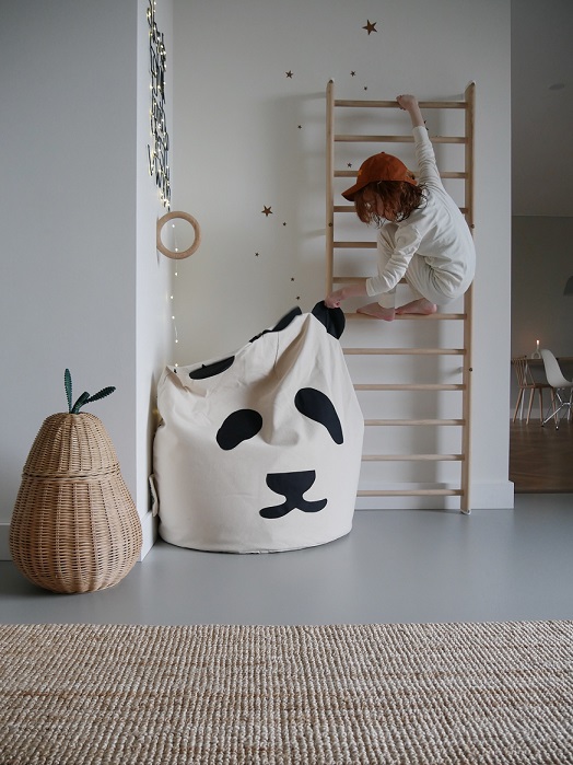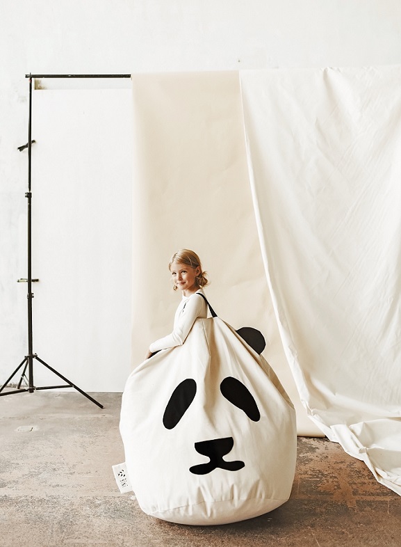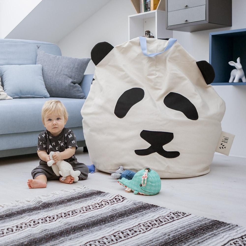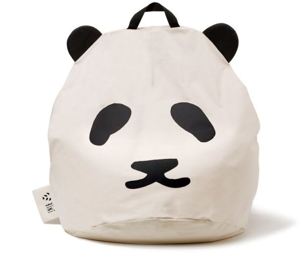 Bini saccosäck har ett motiv av ett gulligt pandamotiv och kan väljas att få med antingen blå eller svarta handtag.