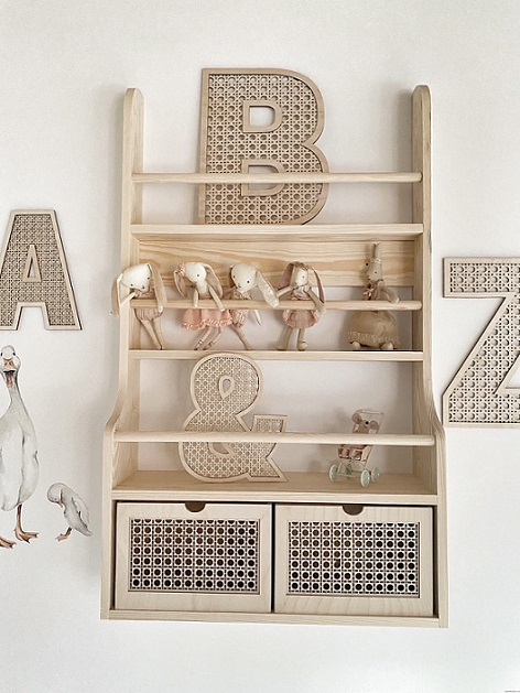 En fantastisk vägghylla för barnrummet som du själv kan ändra utseende på beroende på vad som placeras på den. Det är en rymlig bokhylla där barnet kan lagra sina mest värdefulla ägodelar och sina finaste böcker. Samtidigt med två fina lådor för en bra förvaring.