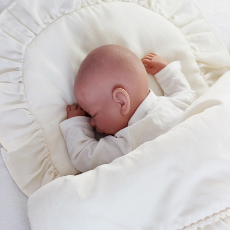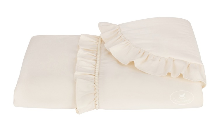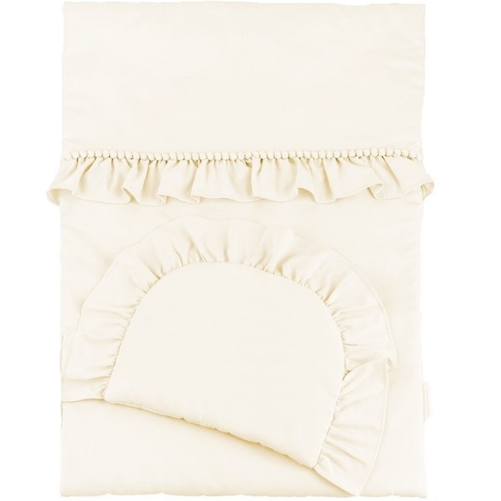 Det ultimata bäddsetet för nyfödda. Gjord av fantastisk bomullssatin vilket garanterar en bra sömn för barnet. Dessutom dekorerad med charmiga volanger längs kanten vilket gör att det ser bedårande ut i barnvagnen eller i vaggan. Detta bäddset garanterar högsta kvalitet för barnet från den första dagen. Observera att påslakanet ej går att ta av från täcket men att hela täcket är tvättbart.