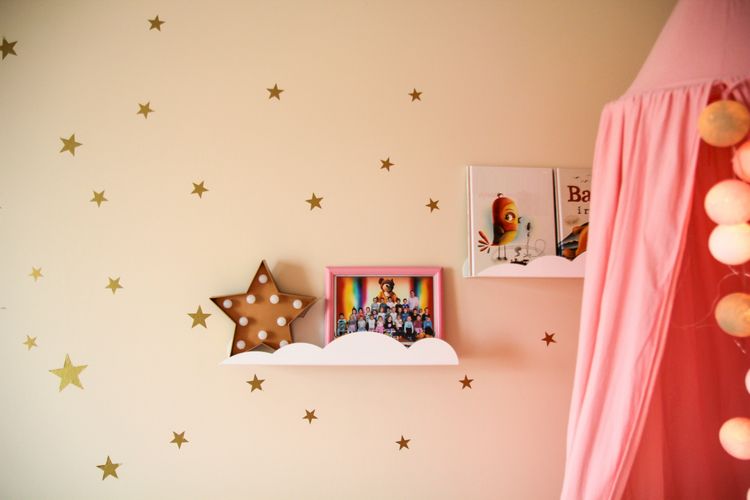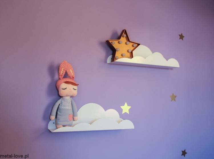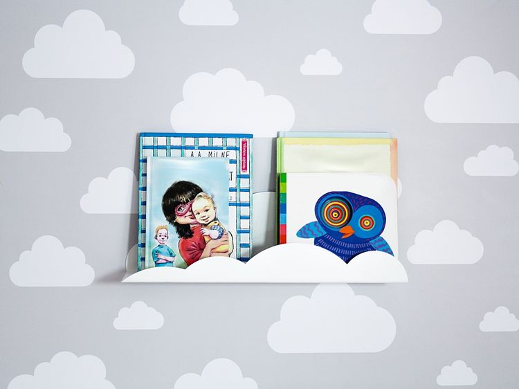 En molnbokhylla är såväl en vacker dekoration på bäggen i barnrummet, som en praktisk inredningsdetalj.