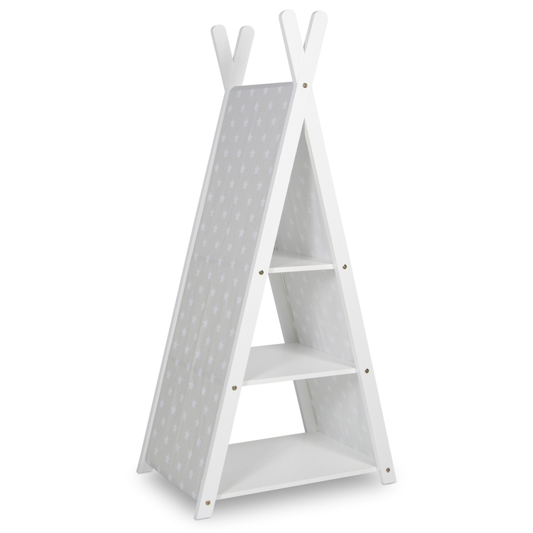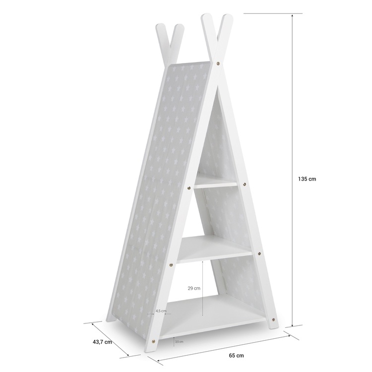 En underbart fin och praktisk bokhylla i formen av ett bedårande tipitält .  Hyllan kan användas som bokhylla, eller för att förvara leksaker och kan dessutom enkelt fästas upp på väggen. Hushyllan är även mycket enkel att hålla ren. Materialet är pinjeträ och den är byggd för att hålla länge och tåla mycket. Perfekt till barnrummet för både sin funktion och sitt utseende.…