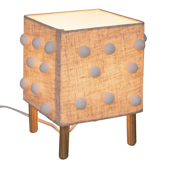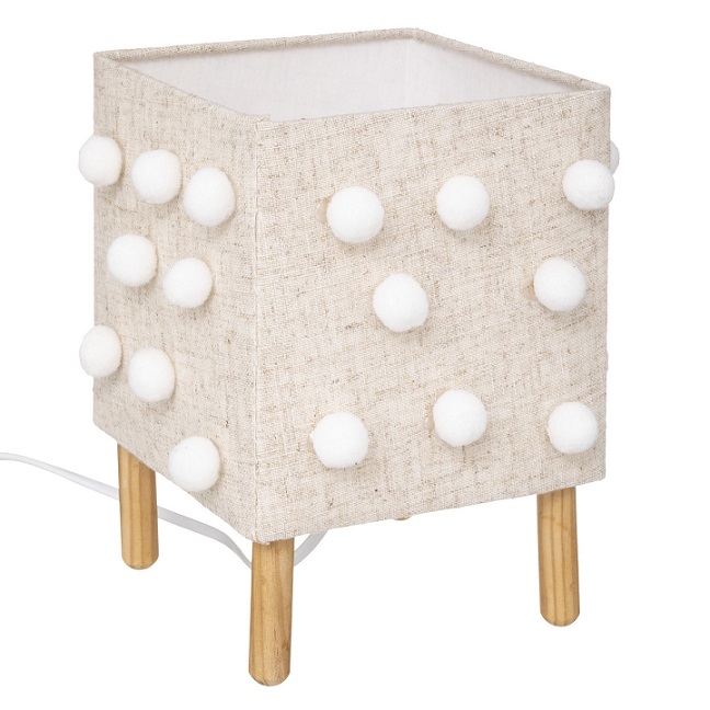 En underbar fyrkantig bordslampa med söta pompom som kommer att ge barnrummet en speciell charm.