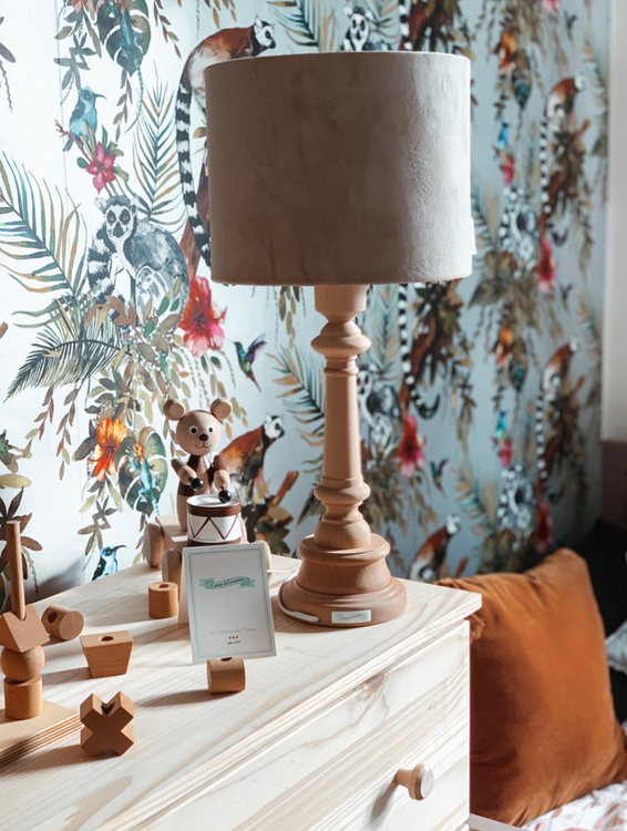 Bordslampan har fin brun färg och kommer att ge barnrummet en speciell charm.