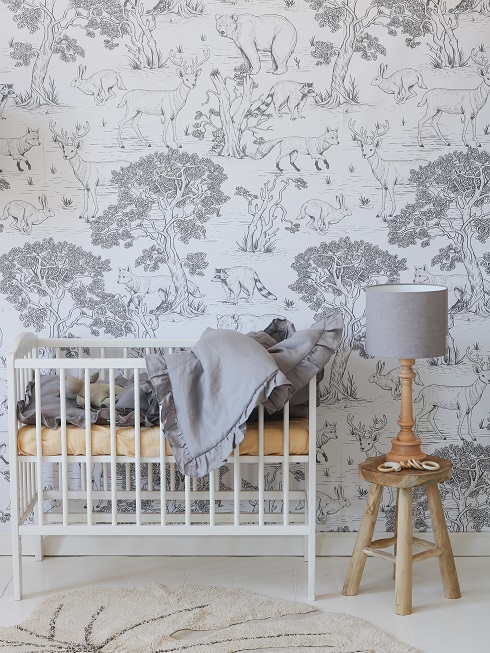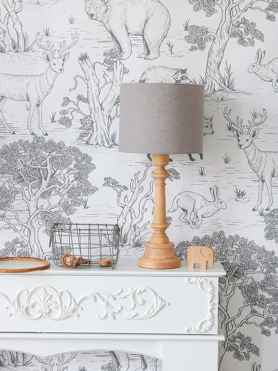 En underbar grå bordslampa till barnrummet med en fin träfot.