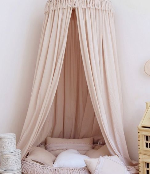 En mycket charmig och vacker rosa sänghimmel tillverkad av högkvalitativt linne. Designad i en enkel form och i en typisk skandinavisk stil. I varje rum som denna används kommer en sagokänsla att spridas. Perfekt för att inreda barnrummet på ett bra sätt. Sänghimmeln är dessutom förberedd med en praktisk anordning i mitten för att kunna hänga favoritsakerna.